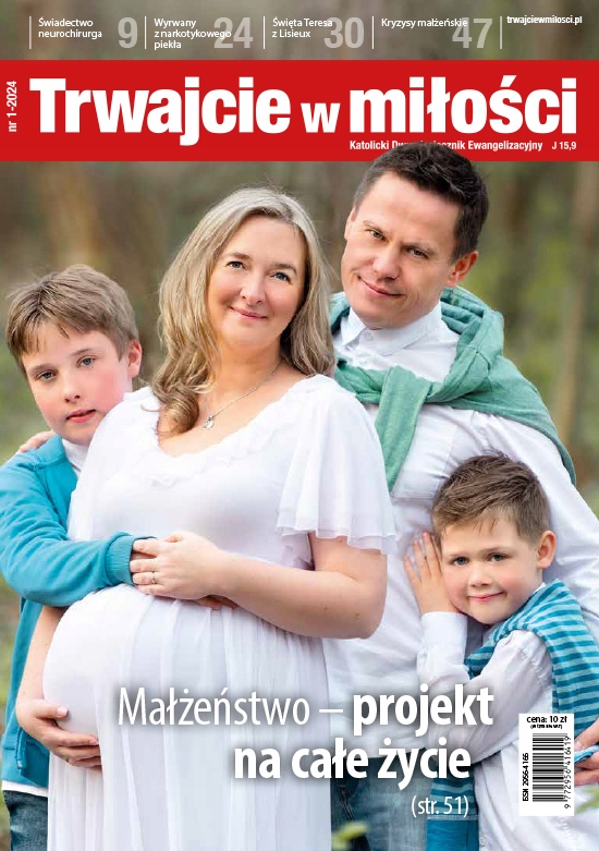 Шановні читачі! Новий рік ми починаємо випуском «Залишайтеся в любові», який містить статті та свідчення, що зміцнюють віру та надію, тому що «Ми знаємо [...], що Бог все діє на благо тих, хто любить Його» (Рим. 8, 28). Запрошуємо до читання! У новому випуску «Стій в любові» (1-2024): Багато чудес відбувається в Лурді. Як на них реагують невіруючі? Про це свідчить доля двох відомих атеїстів: Еміля Золя та Алексіса Карреля. «Христос веде мою руку» – надзвичайне свідчення всесвітньо відомого нейрохірурга, який завдяки молитві вервиці зробив новаторські відкриття в медицині. «Вирваний з наркотичного пекла» - шокуюча історія Веслава, який був на самому дні, а сьогодні проголошує радісну звістку про Бога, який любить кожну людину. «Гріхи проти першої заповіді» - стаття, яка нагадує нам, що людина, яка займається окультизмом, віддає себе під владу демонічних сил. «Шлюб – проект усього життя» — свідчення подружжя, які відновили свої любовні стосунки після кризи, розлуки та зради. Журнал «Залишайтеся в коханні» продовжує місію «Любіть один одного!». Примітка: раніше розміщене замовлення на "Любіть один одного!" Він НЕ переходить автоматично до порядку «Залишатися в коханні». Тому просимо кожного читача оформити у нас нове замовлення – на «Залишайтеся в любові». Це необхідно для того, щоб отримувати журнал "Abide in Love". Замовлення можна зробити: через форму на веб-сайті: zamow.twarzjciewmilosci.pl електронною поштою: @zamowienia телефоном: +48 (61) 306 79 90 поштою: Redakcja "Trwajcie w miłość", ul. Tylne Chwaliszewo 25, 61-103 Poznań