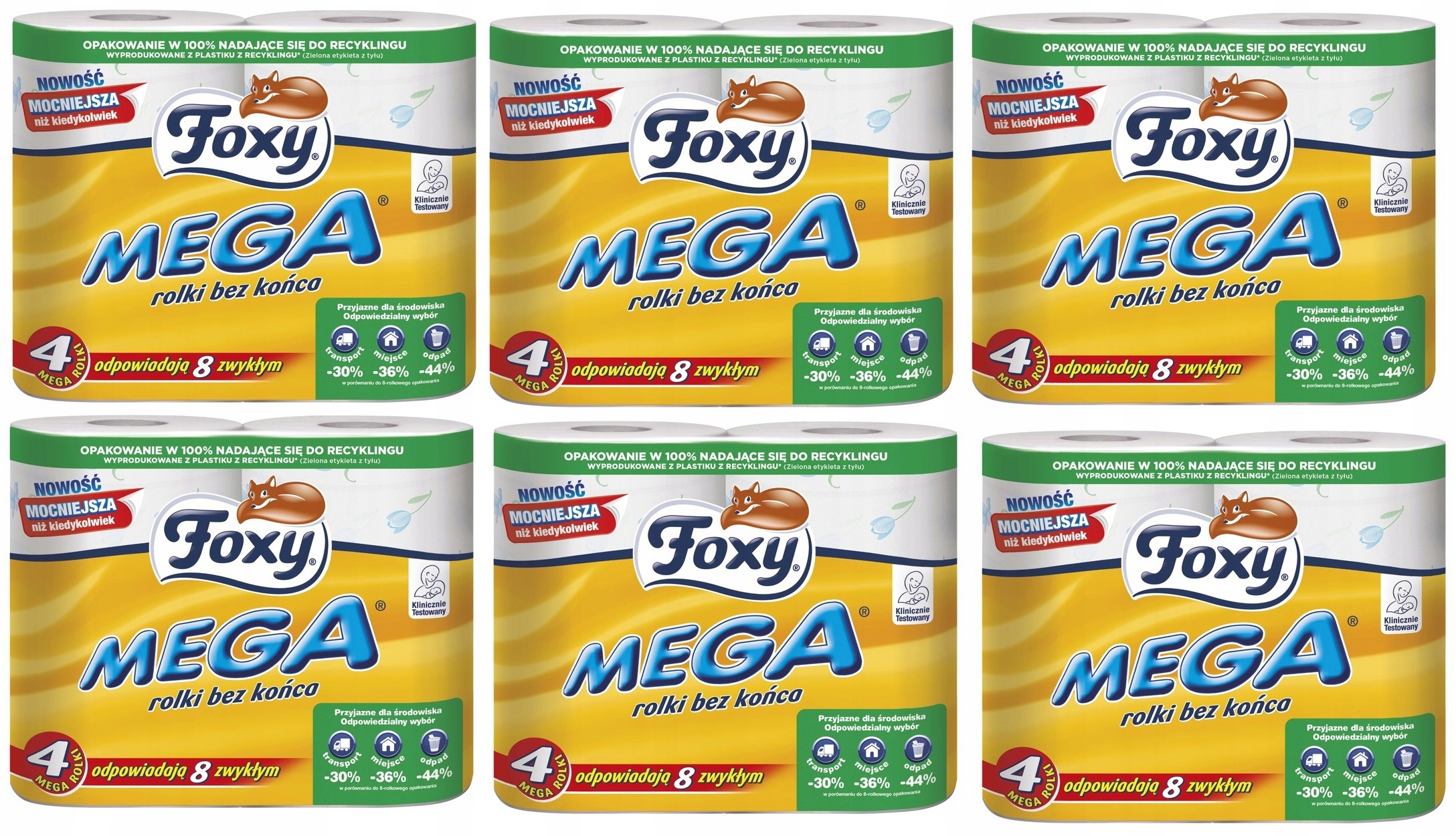 Що більше – 4 рулони туалетного паперу foxy mega, що еквівалентно 8 звичайним рулонам паперу!