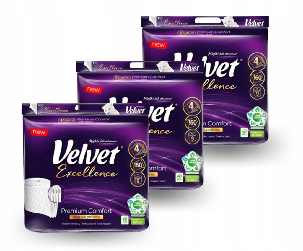 НОВИЙ Туалетний папір Velvet Excellence Premium Comfort– це великі ідеально згорнуті рулони міцного паперу, які складаються 4 шари унікального цигаркового паперу, збагаченого екстрактом протеїну шовкудля ідеального відчуття чистоти. Його м’які, густі та білі листочки, прикрашені естетичним візерунком, відрізняються не лише зручністю та найвищим комфортом у використанні, а й простотою та мінімалізмом, які підходять до декору будь-якого туалету.