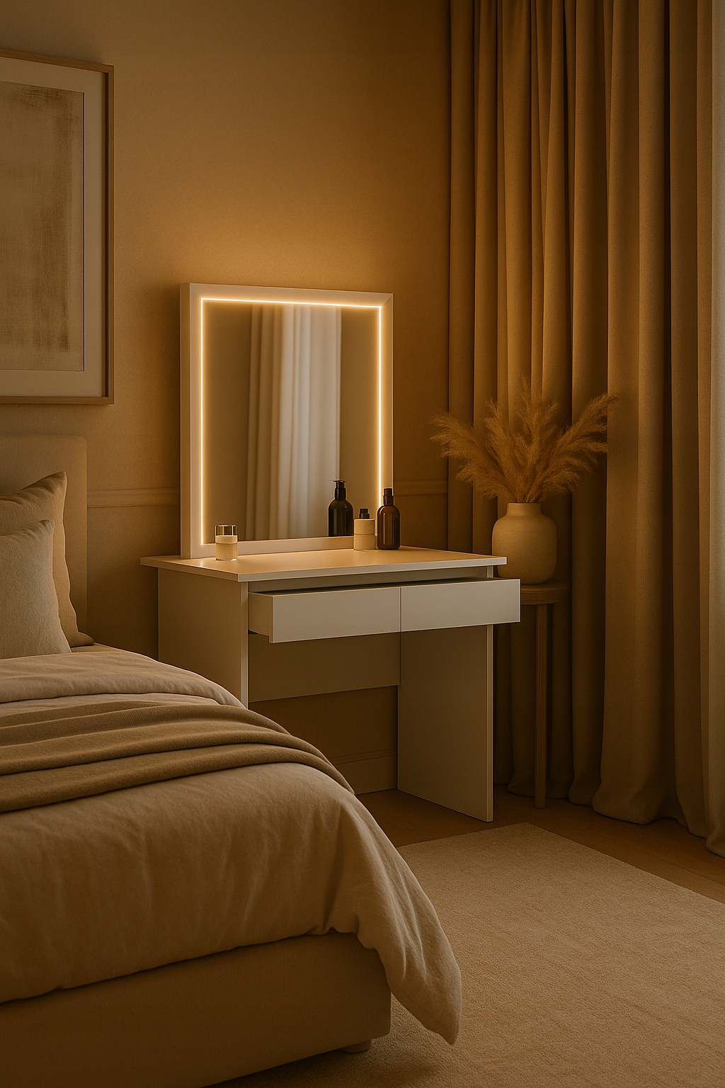 Велике дзеркало з світлодіодним освітленням сприятиме виконанню макіяжу та стилізації зачіски та надає зовнішній вигляд професійної студії. Ми гарантуємо очікування всіх, хто цінує поєднання простоти та витонченості.