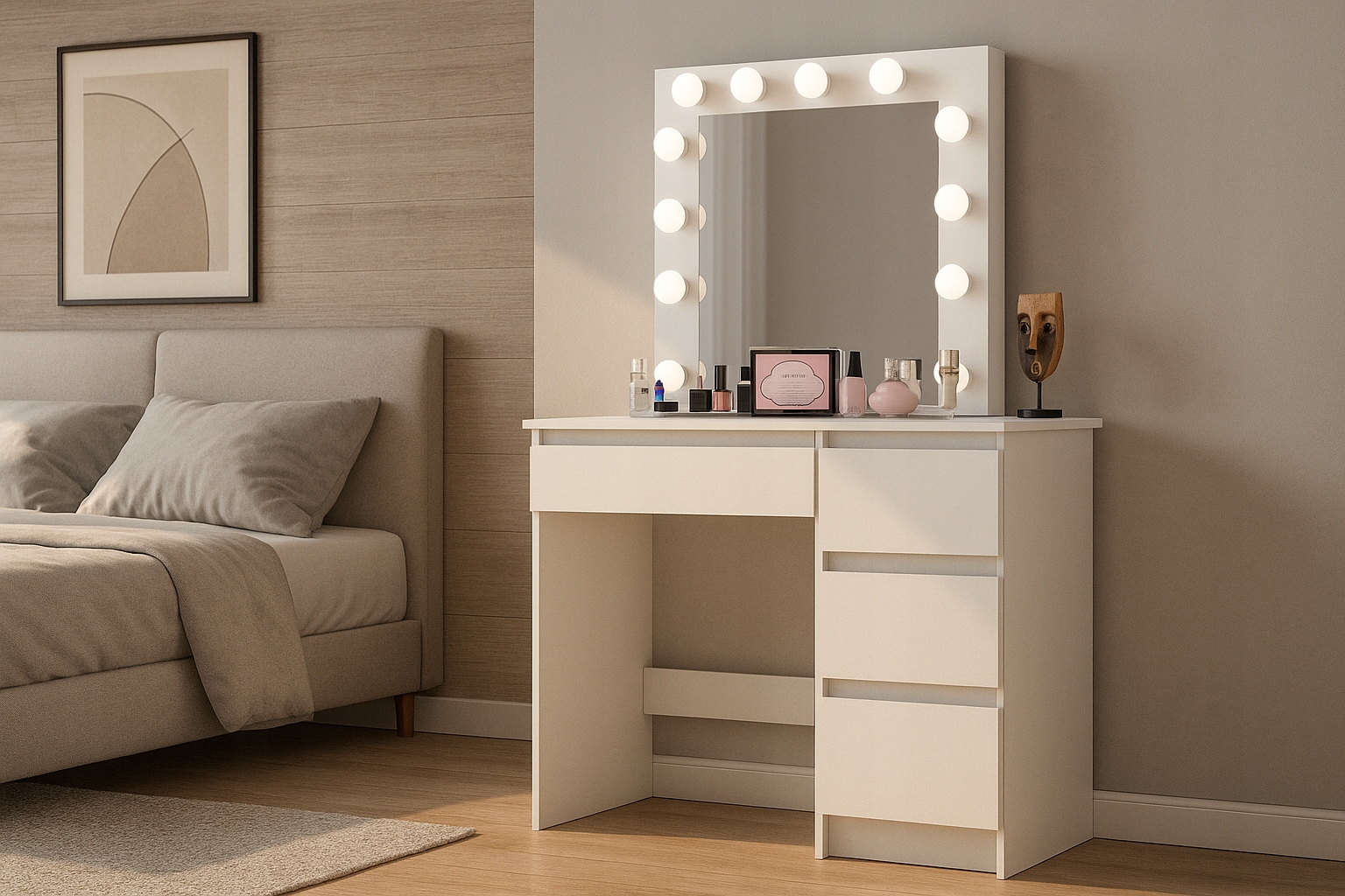 ТУАЛЕТНИЙ СТОЛИК HOLLYWOOD BETI4 З ДЗЕРКАЛОМ І LED-ПІДСВІТЛЕННЯМ – ДЛЯ МАКІЯЖУ ТА ВІЗАЖУ – ПОЛЬСЬКЕ ВИРОБНИЦТВО