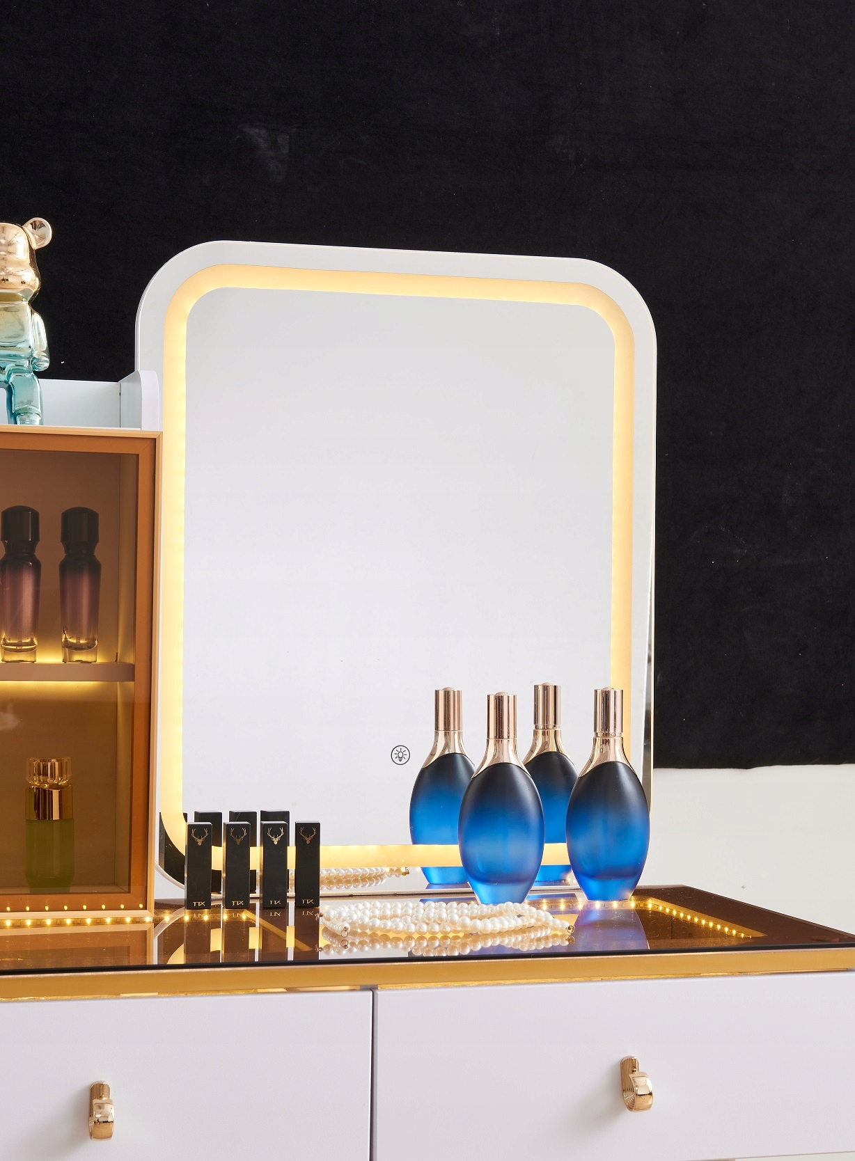 Стильний і функціональний туалетний столик - ідеальне місце для щоденного догляду та нанесення макіяжу. Оснащений великим дзеркалом з енергозберігаючим світлодіодним підсвічуванням, він забезпечує чудове освітлення, яке полегшує точне підкреслення вашої краси.