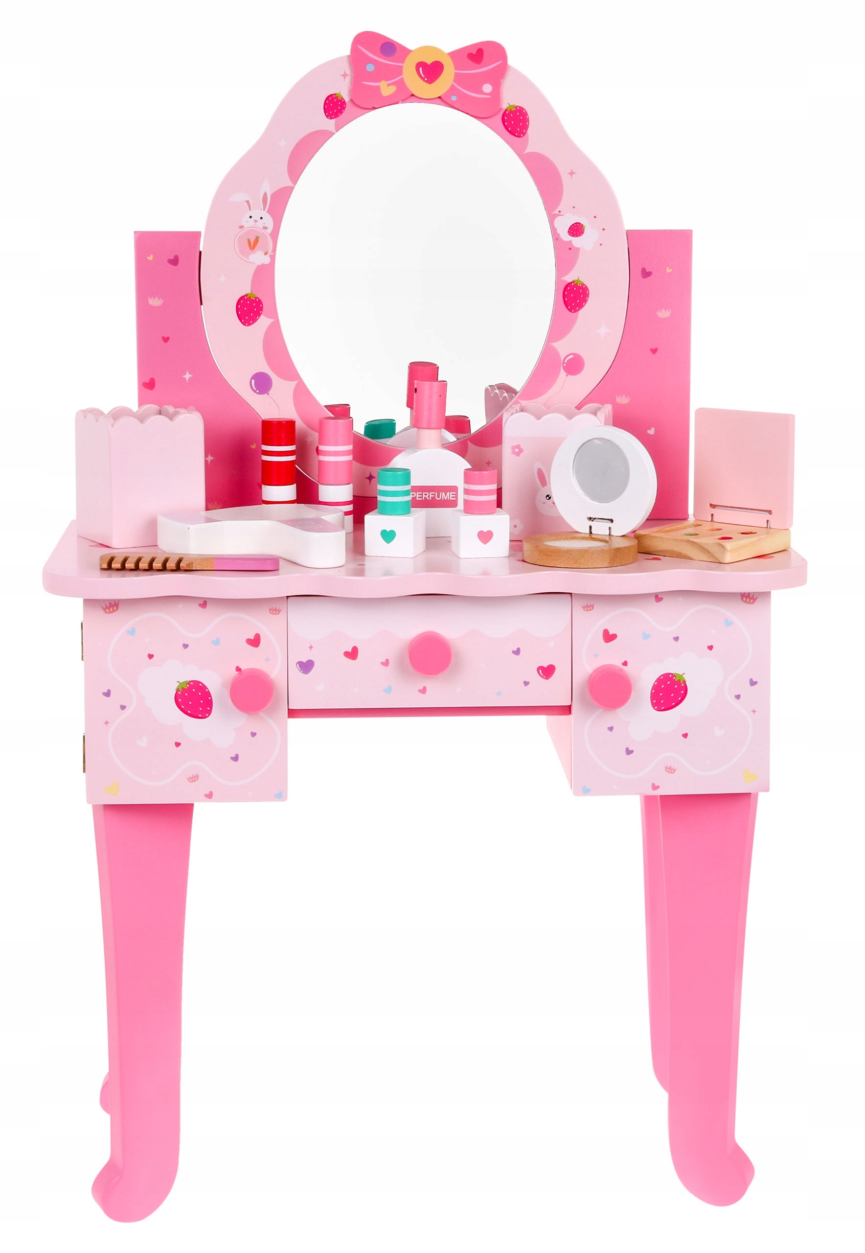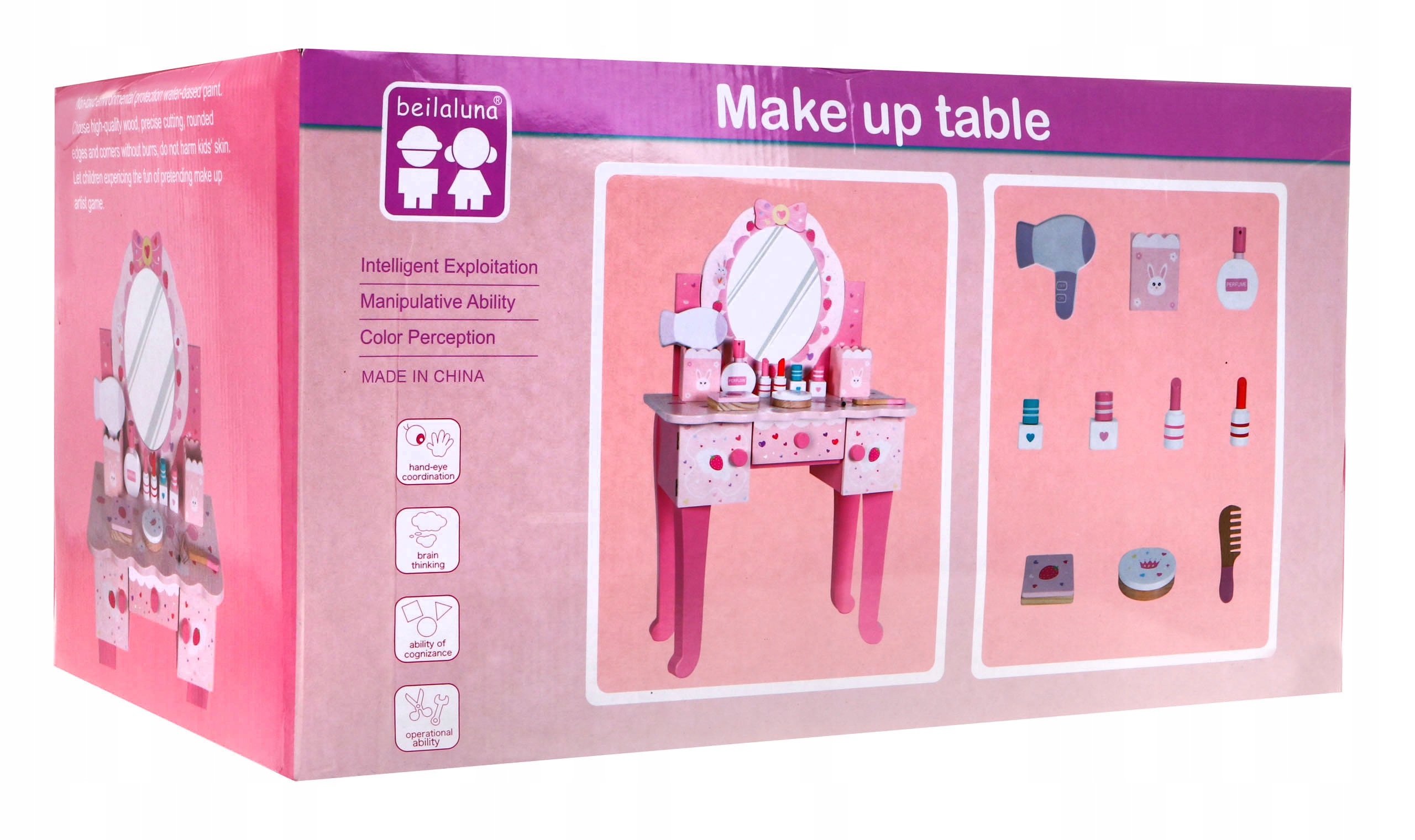 - Опис Дерев'яний туалетний столик + дерев'яний аксесуар дерев’яний туалет з табуреткою, справжнім дзеркалом, відкриттям ящиків та аксесуарами, це пропозиція для маленьких принцес 3 років. Мега барвисті, ідеально виготовлені, дерев’яна, намальована нетоксичною фарбою на основі води, закруглених бордюрів, стабільних та безпечних. Комплект самозбірки. Розміри- Таблиця валідної таблиці Прибл. 72 см х 45 см х 23 см,- табурет прибл. 23,5 см х 22 см,- сушарка прибл. 12,3 см х 11,5 см х 2 см,- контейнери прибл. 8 см х 6,5 см х 6 см,- упаковка 2 контейнери,- 2 помади,- 2 лак для нігтів,- парфуми,- гребінець,- фарбування олівця,- сушарка,- тіни,- порошок,- гвинти,- ключ Аллен,- Інструкції з збірки.