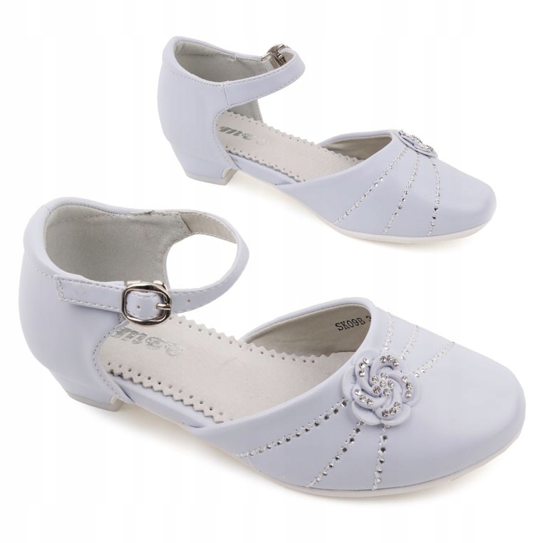 Взуття для спілкування дівчат з низьким набором 3 см. Закріплений вузьким ремінцем закінчується пряжкою. Закруглений ніс. Модель із покритими пальцями та побудованою каблукою. Розшифровано спереду квіткою з цирконами. Тінь взуття потрапляє в синій колір. Ідеальна модель для чудових результатів весілля або причастя.