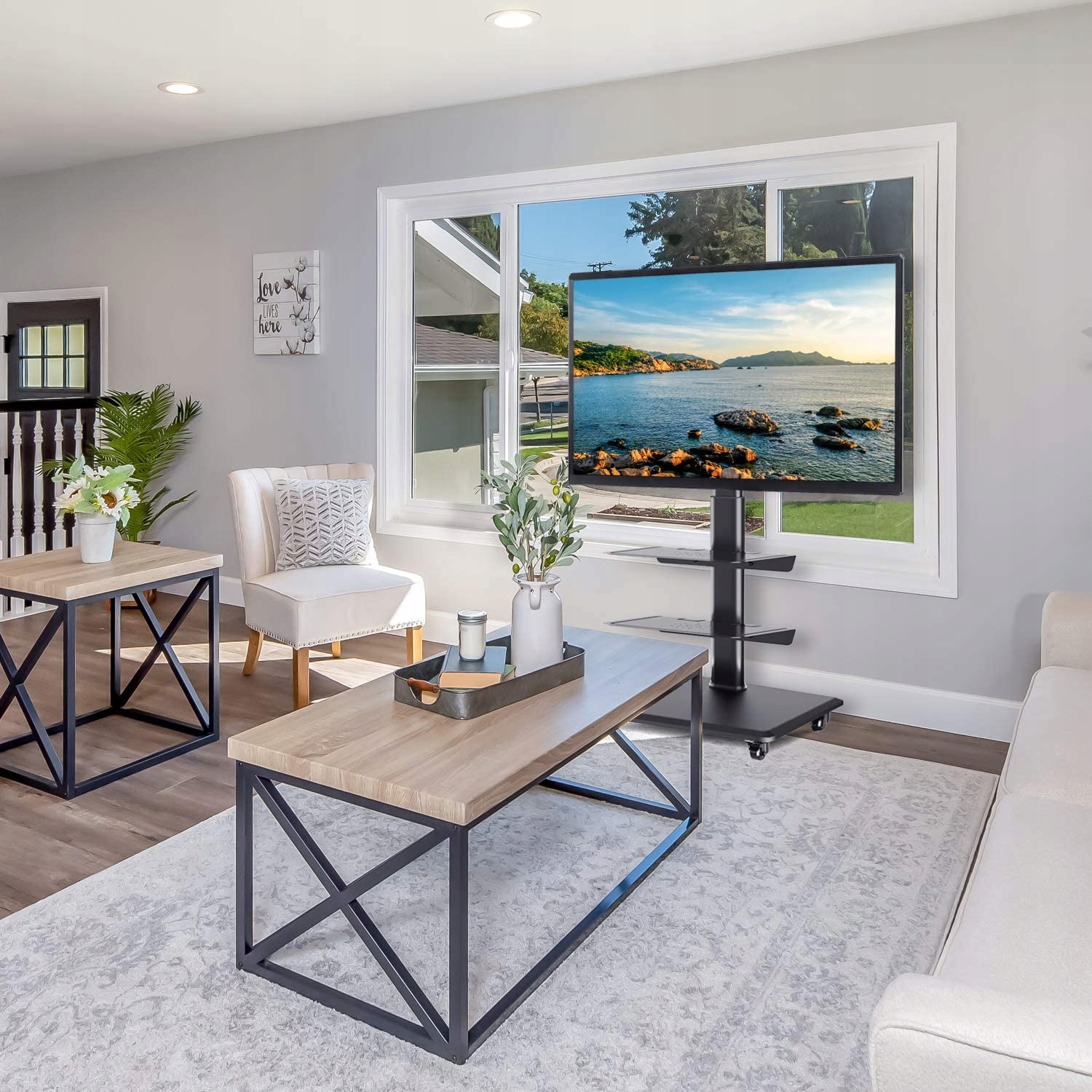 Підставка на колесах може підняти підставку телевізора, її також можна використовувати замість настінного кріплення для телевізора, але не потрібно свердлити красиву стіну. Більше для вас, ця підставка для телевізора включає в себе систему прокладки кабелів, щоб тримати речі в порядку та ваші аксесуари. Відкриті полиці з чорного загартованого скла ідеально підходять для більшості DVD-програвачів, HD-рекордерів, відеореєстраторів, кабельного телебачення та інших аудіо/відео компонентів. Кріплення з рухомими та регульованими по висоті функціями для кращої видимості. Високоефективні коліщатка на передніх колесах забезпечують стаціонарну або мобільну підставку під телевізор за запитом. Ідеальний телевізійний дисплей, який можна розмістити в будь-якій кімнаті вашого будинку чи офісу. Наша міцна система кріплення захищає ваш плоский екран. Регульовані кріплення VESA підходять для більшості телевізорів розміром від 27 до 55 дюймів і сумісні з VESA від 100 x 100 мм до 400 x 400 мм.