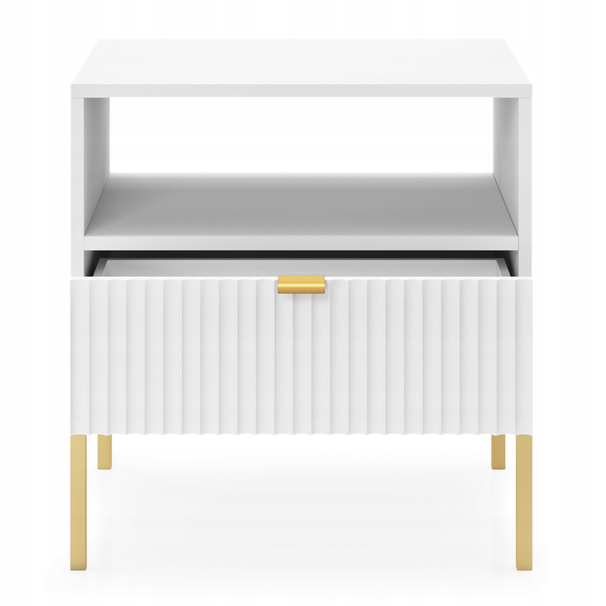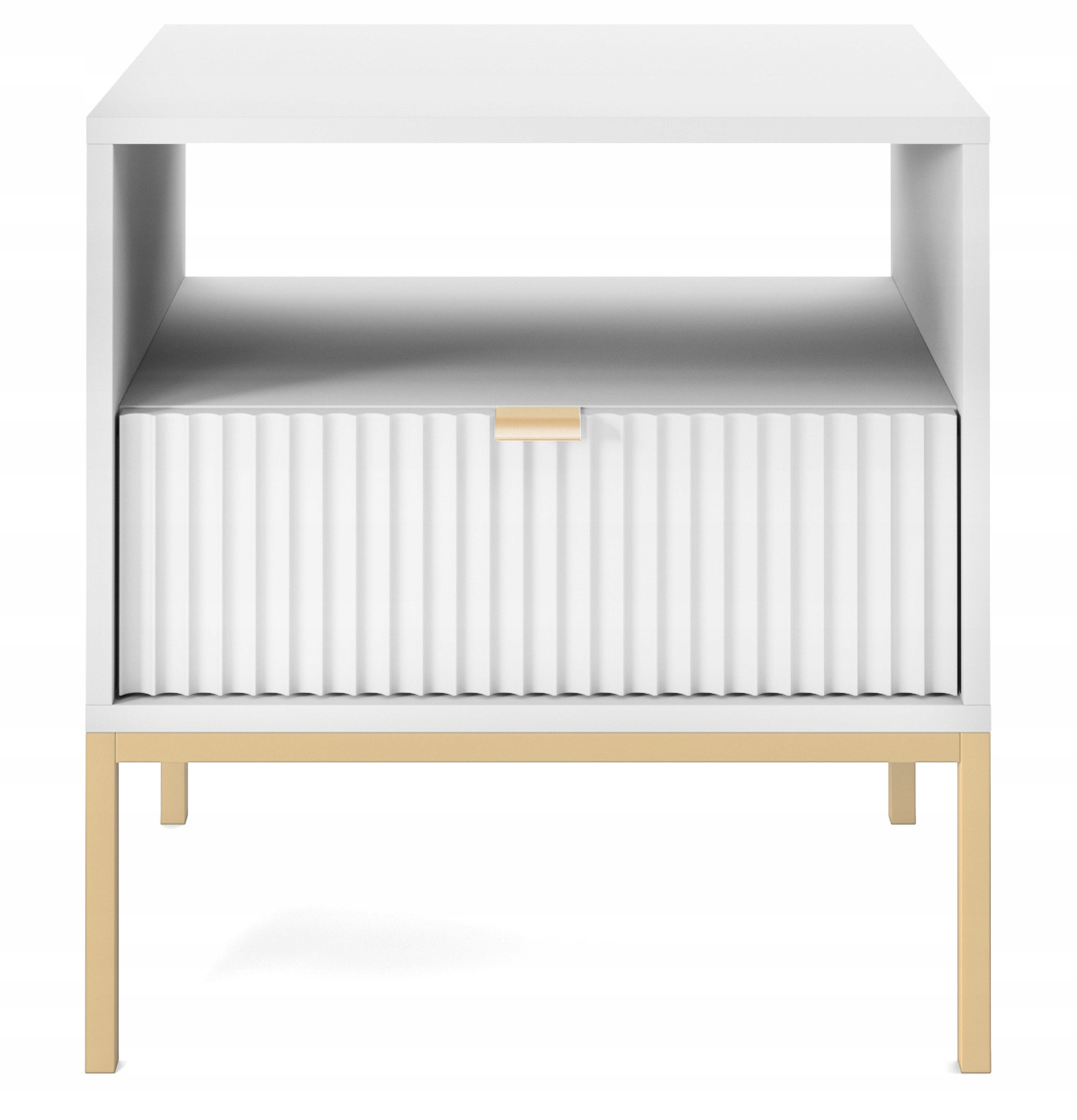 Мрієте про дизайн, який буде схожий на обкладинку журналу про дизайн інтер’єру? Бажаєте облаштувати свою квартиру так, щоб надовго запам'яталася вашим гостям? Колекція Vellore надасть вам потрібні інструменти для цього! Тумбочка Vellore - чудовий спосіб використовувати вільний простір у спальні. Ви можете легко розташувати цей акуратний предмет меблів між ліжком і стіною, забезпечивши собі додатковий простір для зберігання дрібниць, необхідних під час нічного відпочинку. Гладкий верх виробу дозволяє стійко розмістити склянку з водою або нічник. У відкриту нішу або ящик можна сховати знеболюючі, телефон або улюблену книгу, щоб не наштовхнутися на них під час нічних походів у ванну. Vellore також має елегантний дизайн. Особливу увагу тут приділяє передня частина, покрита декоративними канавками, і геометрична рамка зі сталі з порошковим покриттям. Все це доповнюється алюмінієвою, золотою ручкою, яка надає меблям елегантний характер. Vellore вражає своїм білим кольором. Використаний відтінок дозволяє легко вписати його в широкий спектр стилів дизайну інтер’єру, що значно полегшує створення спальні вашої мрії! Деталі продукту: