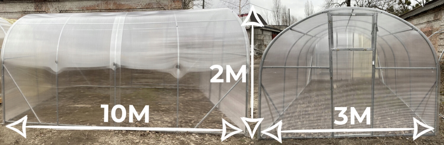 Товщина полікарбонату 4 мм (6 мм також за доплату), термін служби від 8 до 10 років в залежності на погодні умови і вам не доведеться знімати його взимку. Стійкість до UV4 променів. Він кріпиться до рами з нахлестом 5 см (інші 5 см виступають над верхівками тунелю, щоб закрити вертикальні полікарбонатні пластини спереду та ззаду) за допомогою саморізів.