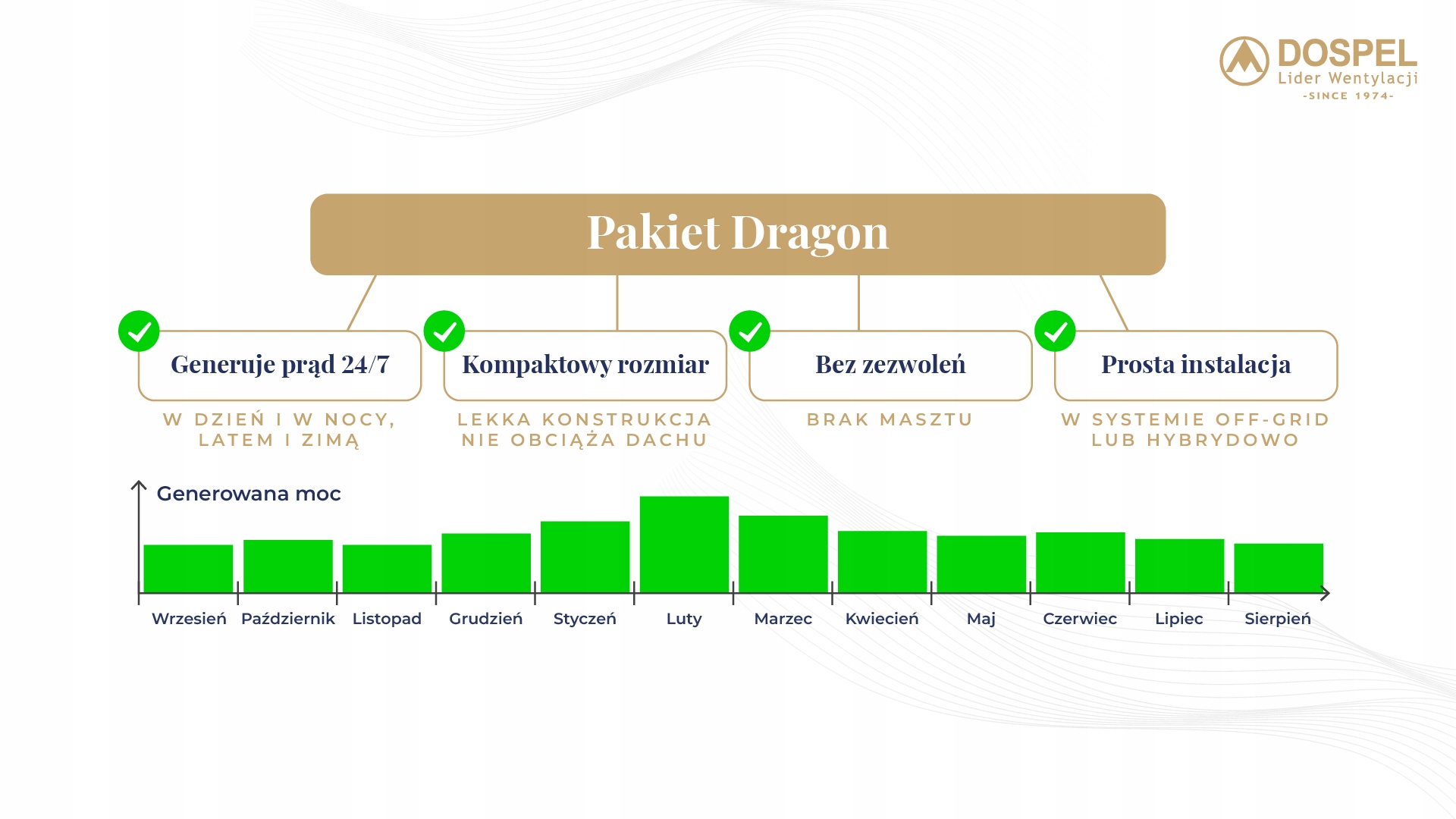 ? Вітрогенератор Dospel Dragon 500+ виробляє електроенергію вдень і вночі, влітку і взимку, понад 320 днів на рік! Тому це ідеальне доповнення до фотоелектричної системи. Ефективність фотоелектричних панелей у Польщі становить 15-20%. Завдяки гібридній установці з використанням вертикальних вітрогенераторів Dospel Dragon ефективність виробництва електроенергії підвищується до 60%.