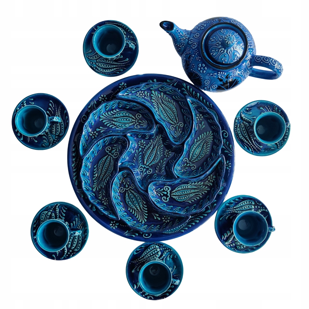 Загальні назви:Бірюзовий набір турецьких чашок ручної роботи, декоративний набір чашок, барвистий керамічний набір, набір для сервірування, турецький керамічний чайний набір, візерунковий турецький керамічний набір, набір для подачі напоїв, турецький керамічний набір для подачі їжі, кераміка Iznik