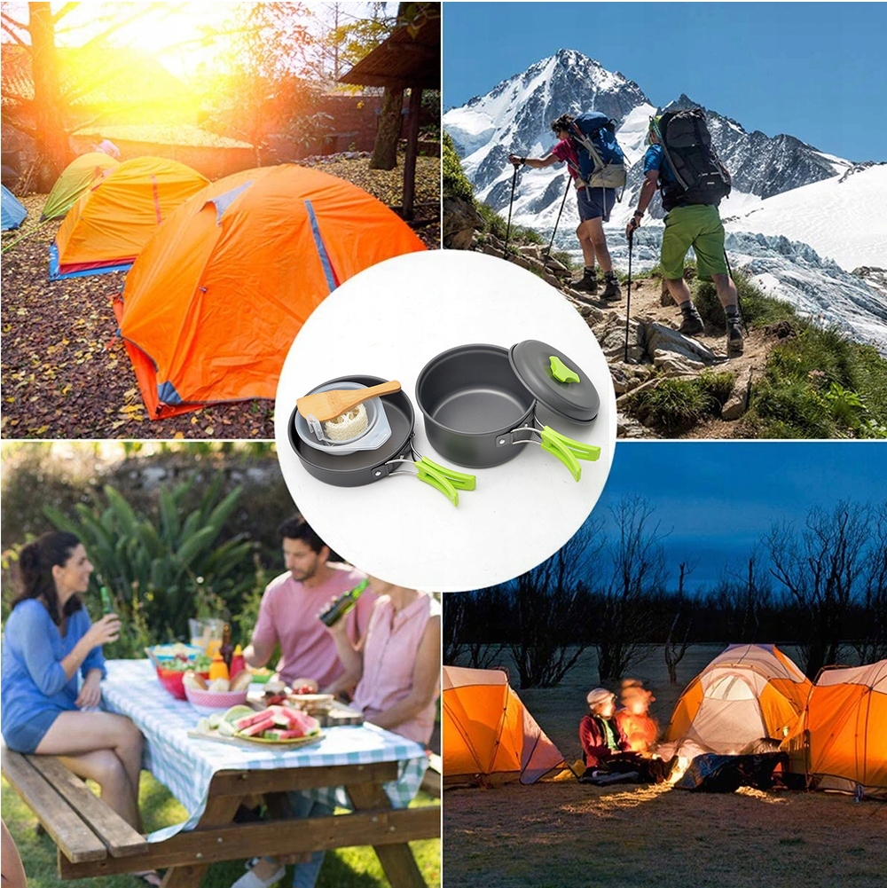 - Наш набір включає цілих 8 необхідних кожному туристу елементів: каструля, сковорода, кришка, засіб для чищення. , дерев’яна ложка, пластиковий складаний ополоник і 2 пластикові миски.