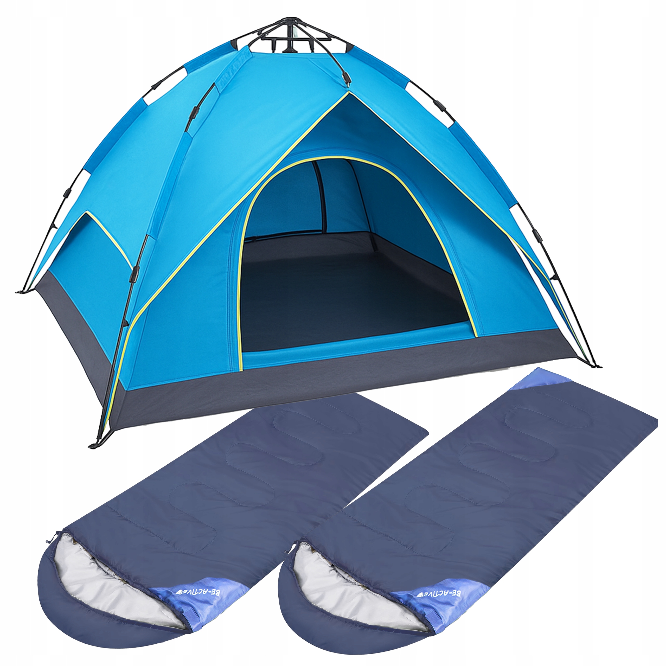 У наборі ви отримуєте намет для 3 людей та два темно -сині спальні мішки .