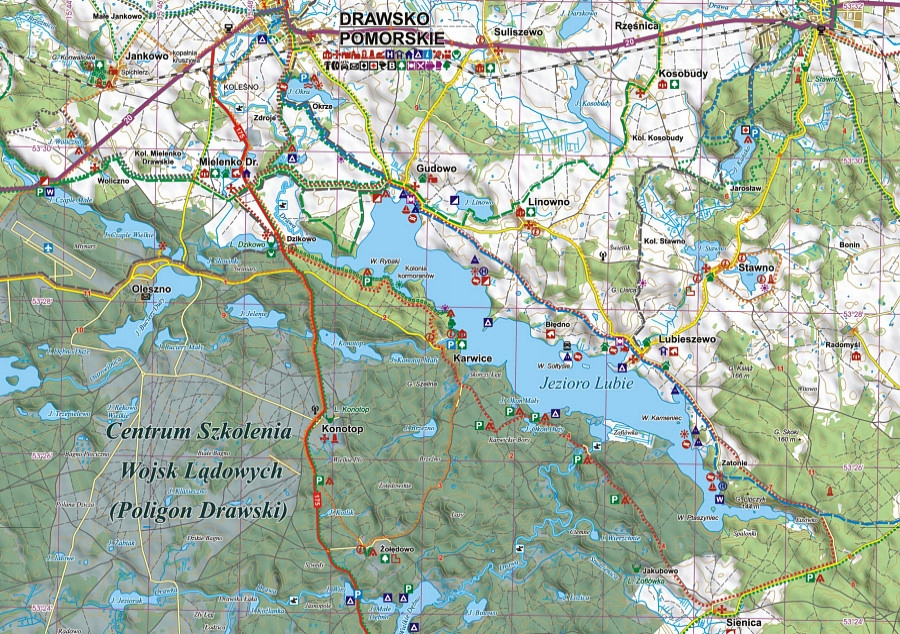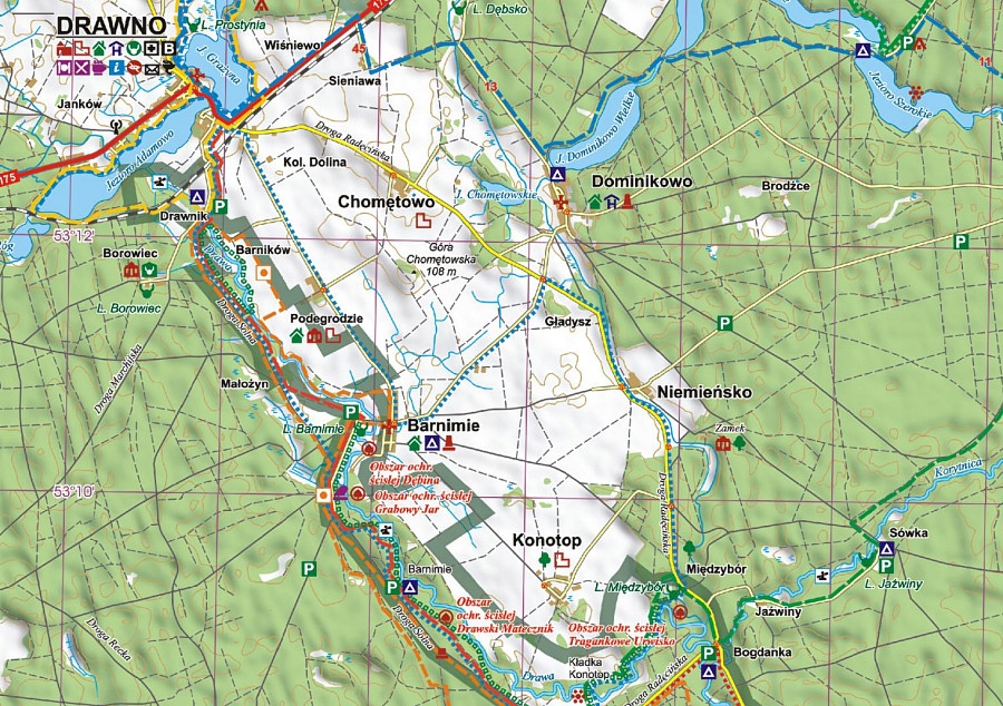Карта, рекомендована нашою Службою маркованих туристичних стежок Західнопоморського воєводства. Усі зміни та нові маршрути наших туристичних стежок запроваджено в національному парку Драва.