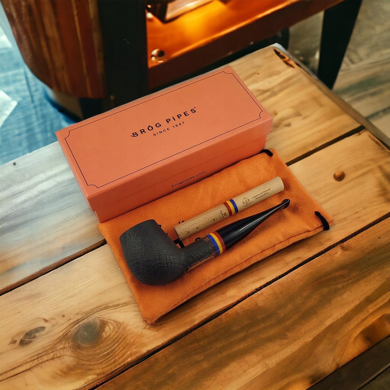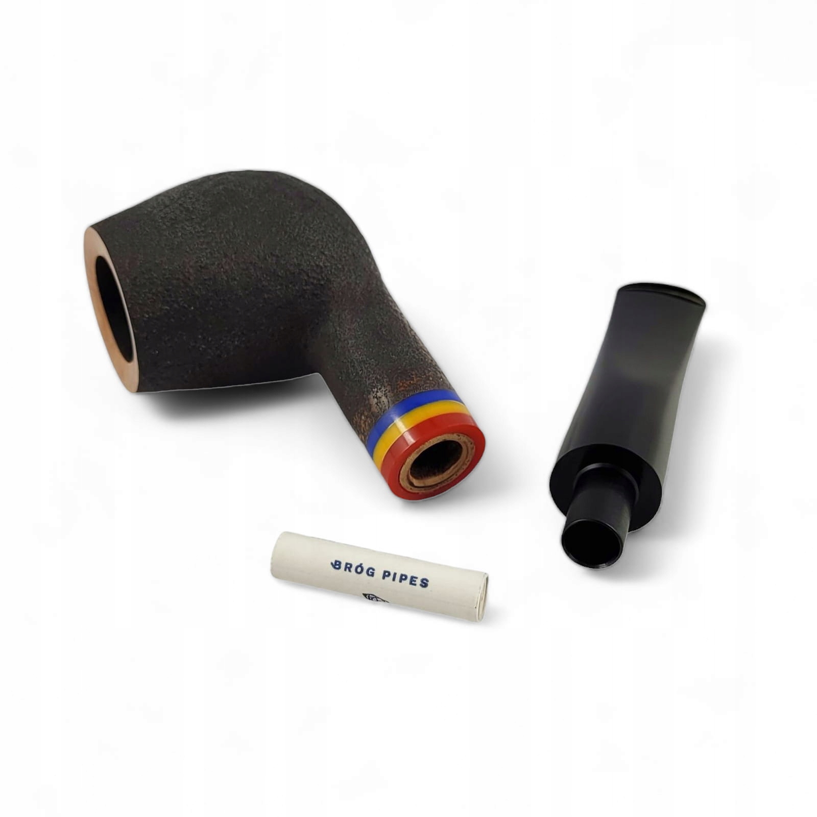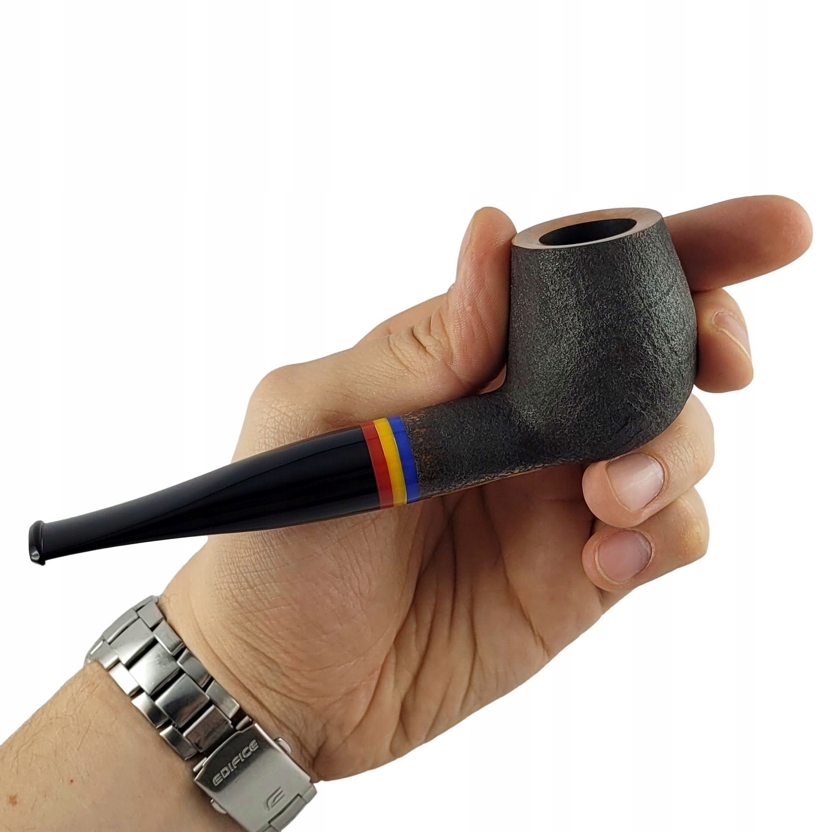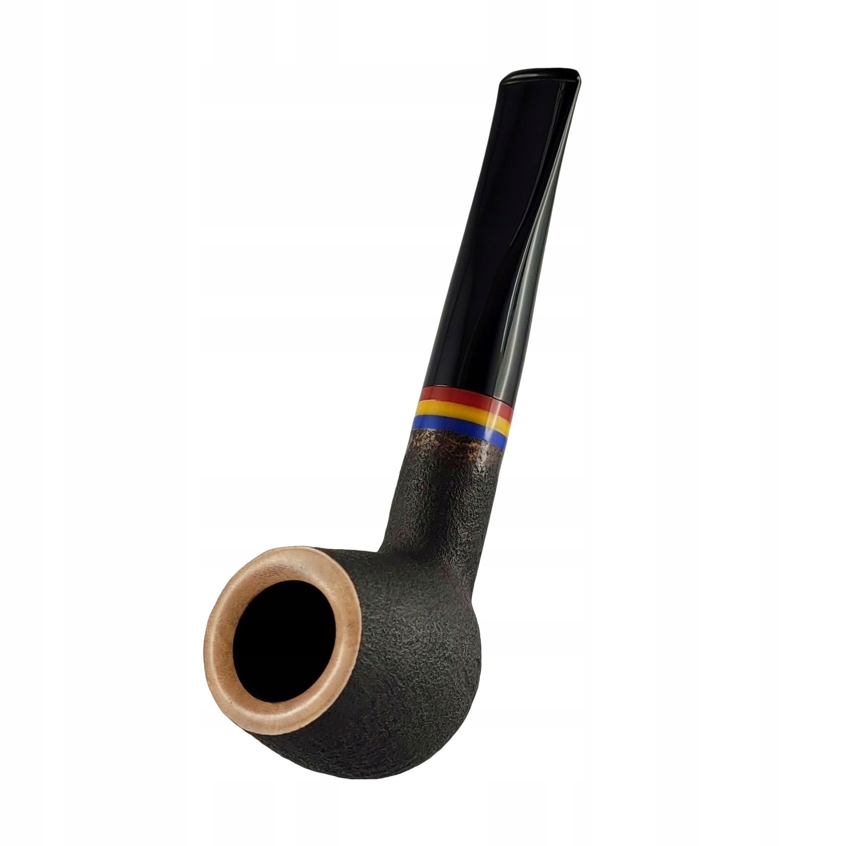 Турнірна сопілка ручної роботи з італійського шипшини (Міммо - Лігурія). Головка і горловина труби піскоструминна, з обідком і місцем для натуральної розмітки. Прекарбонізований камін. Кільце в колір румунського прапора виготовлено з акрилу, такий же мотив можна знайти на дерев'яній вибійці, що входить в комплект. Мундштук чорного кольору або кольору слонової кістки також виготовлений із міцного акрилу, тефлоновий штекер із місцем для фільтра 9 мм. Люлька упакована в тканинний чохол і подарункову коробку. Пропонуємо вам переглянути велику фотогалерею пайпу та самої події. Рекомендуємо, кількість штук дуже обмежена.