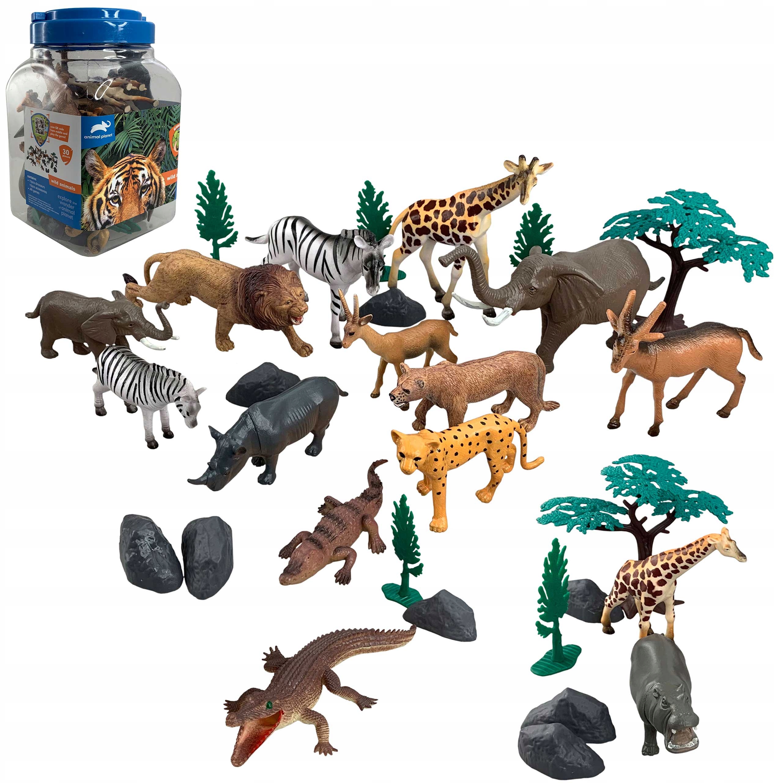 - 30 елементів: 15 шт. фігурки тварин (лев, зебра, жираф, крокодил, слон та інші), 15 шт. дерева, скелі та рослини.