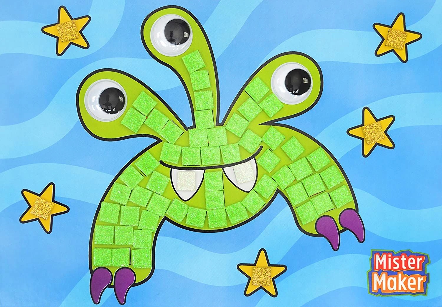 - набір для створення 5 картинок кумедних монстрів (є 7 блискучих форм з квадратиками для розміщення на картинках, пластикові очі та інструкція),