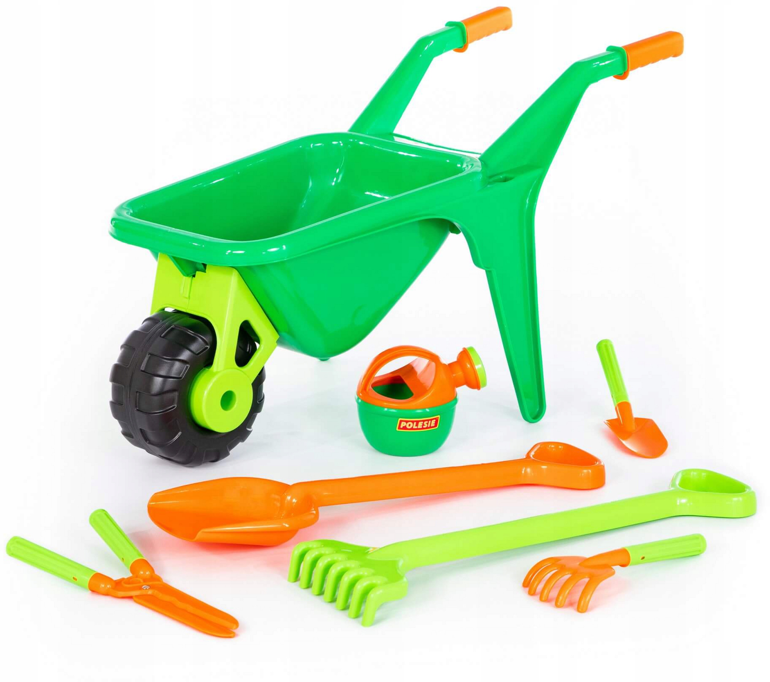 Незамінний дуже великий набір для гри на піску, в саду на пляжі чи ігровому майданчику, що складається з 7 аксесуарів для піску, таких як: тачки на широкому колі, невеликі захоплення, невеликий совок, великі лопатки та полив.