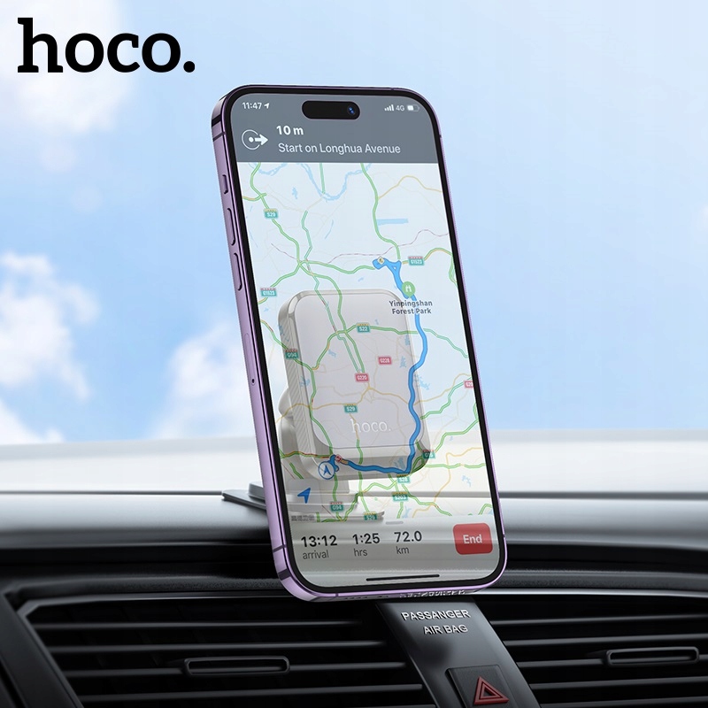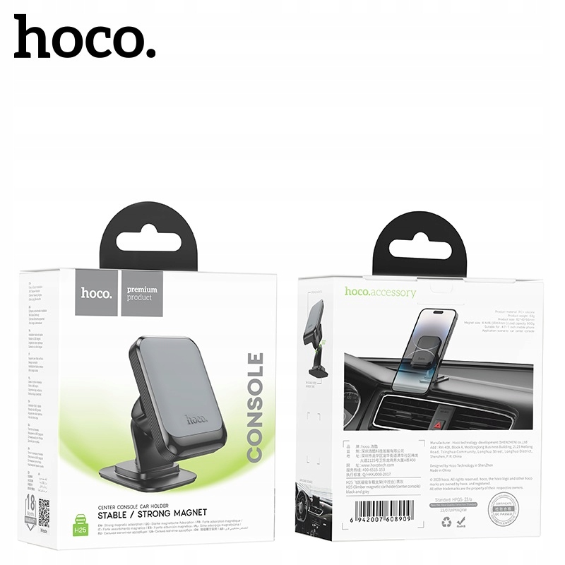 hoco. H25 Climber - магнітний автомобільний тримач для телефону / для телефону, призначений для кріплення на приладовій панелі / кабіні / центральній консолі автомобіля / транспортного засобу / автомобіля за допомогою двостороннього скотча, оснащений вертикальним кронштейн для кріплення та регульована головка, що дає необмежені можливості регулювання та адаптації до власних потреб водія та кульовий шарнір, призначений для мобільних телефонів/смартфонів або планшетів вагою не більше 0,5 кг та розміром дисплея від 4,7 до 7 дюймів. Тримач має підвіску для кабелю зарядки вашого пристрою.