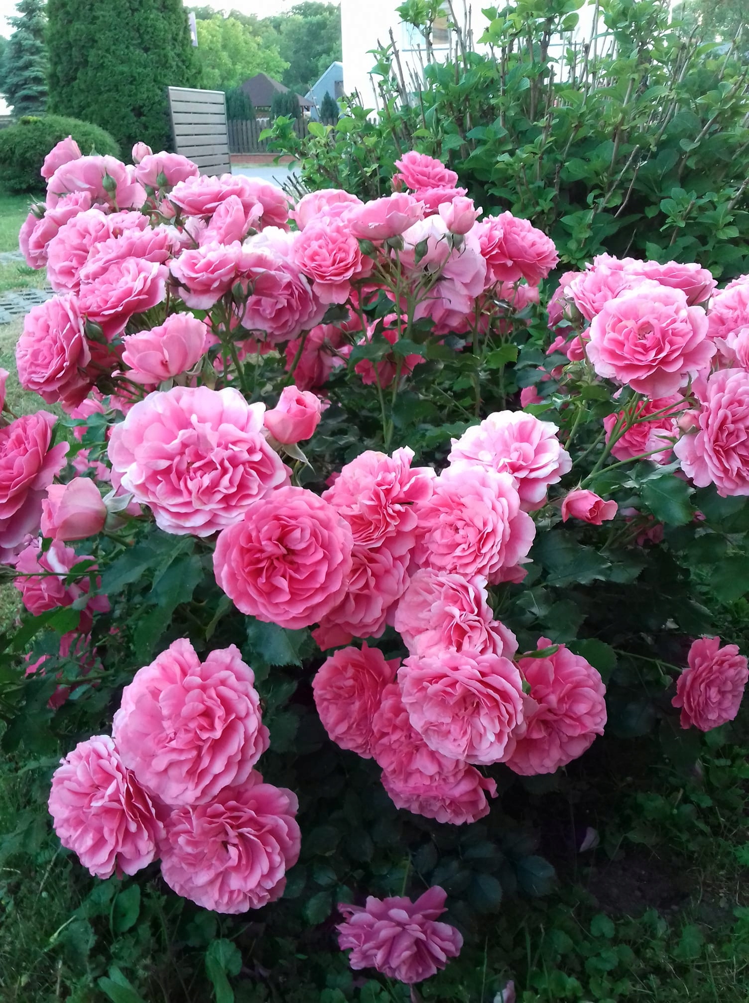 Один з кращих сортів з рожевими квітками, дуже живий. Високий, добре розгалужений кущ. Стебла прямі, вертикально зростаючі, молоді, світло-коричневі, потім оливково-темно-зелені, без шипів. Бутони злегка рожеві, квітки інтенсивно-рожеві, досить великі, заповнені, лускоподібні, зазвичай розміщені кількома групами на широко розгалужених пагонах. Цвіте рясно і довго. Досить стійкий до морозів і хвороб. Цвіте з середини червня і повторюється до осені.