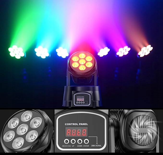 - Нова версія надяскравого сценічного світла RGBW: 7 рухомих прожекторів потужністю 15 Вт, джерело світла RGBW «чотири в одному», яке може плавно змішувати понад 16,7 мільйонів кольорів, покращена високоефективна оптична лінза, збільшена яскравість на 60%. Дальність променя 5 метрів, оптичний кут 25 градусів. Їх можна використовувати як сценічне освітлення, освітлення ді-джеїв, стробоскопи та кольорові ліхтарі
