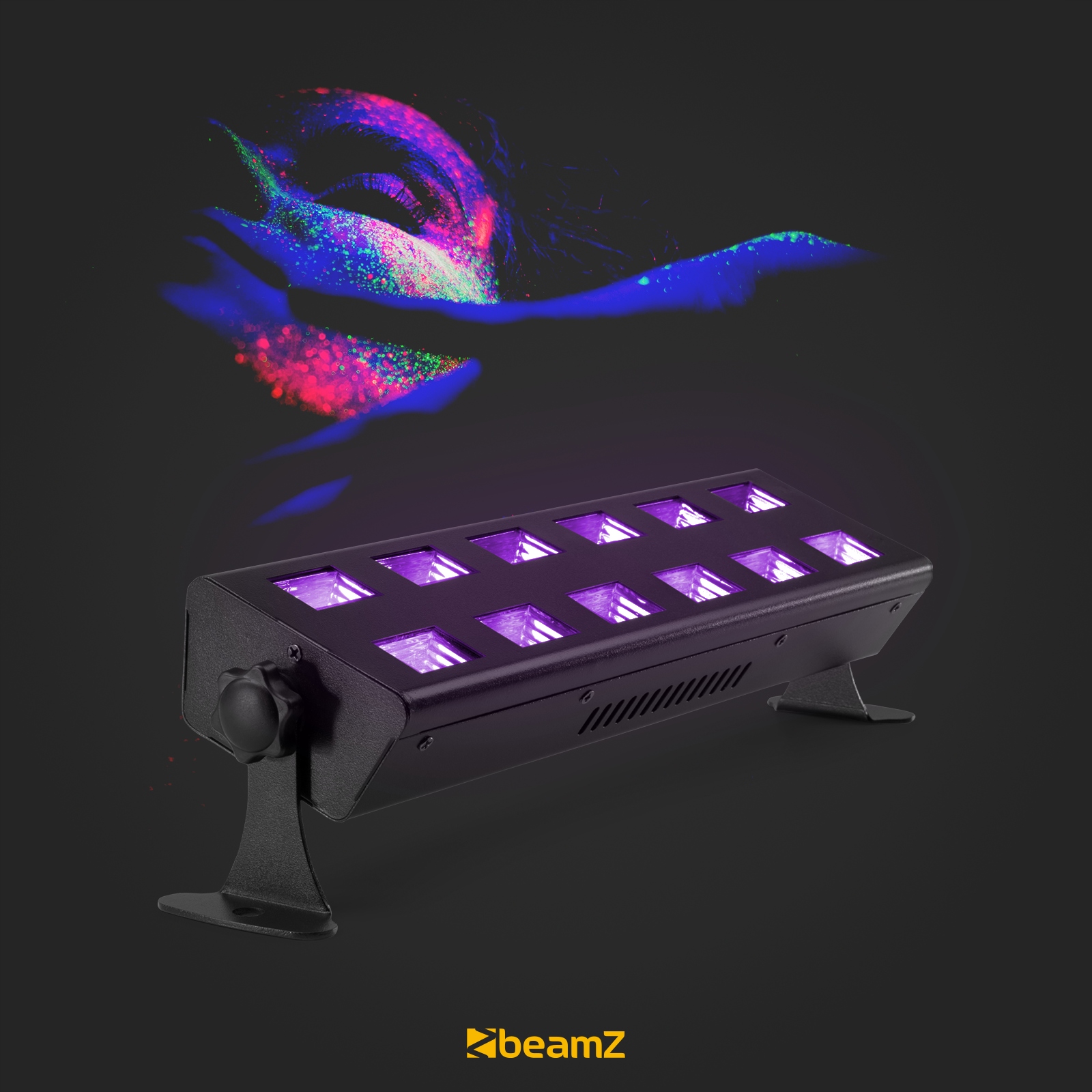 УФ-світлодіодна стрічка BeamZ має 12 потужних УФ-світлодіодів потужністю 3 Вт кожен. Ідеально підходить для проектування чорного світла у великій кімнаті. Забезпечує унікальне шоу на білих речах або одязі. Ультрафіолетовий промінь дуже простий у використанні, просто підключіть його та насолоджуйтеся потужністю освітлення. Тому BUV263 ідеально підходить для доріжок для боулінгу, кафе, клубів, квест-кімнат тощо.