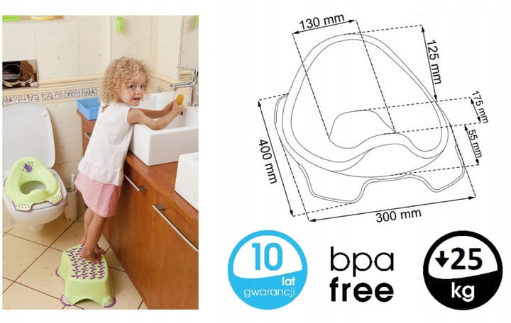 Це сидіння для унітазу має розміри 40 x 30 x 15 см і розроблено з думкою про дітей. Його контури забезпечують зручність і комфорт під час використання туалету. Протиковзкі краї роблять накладку стабільною та безпечною у використанні. Максимальне навантаження 25 кг. Накладки прикрашені красивою графікою, виконаною за технологією IML, що гарантує їх довговічність і стійкість до пошкоджень. Важливо, що продукт не містить BPA.