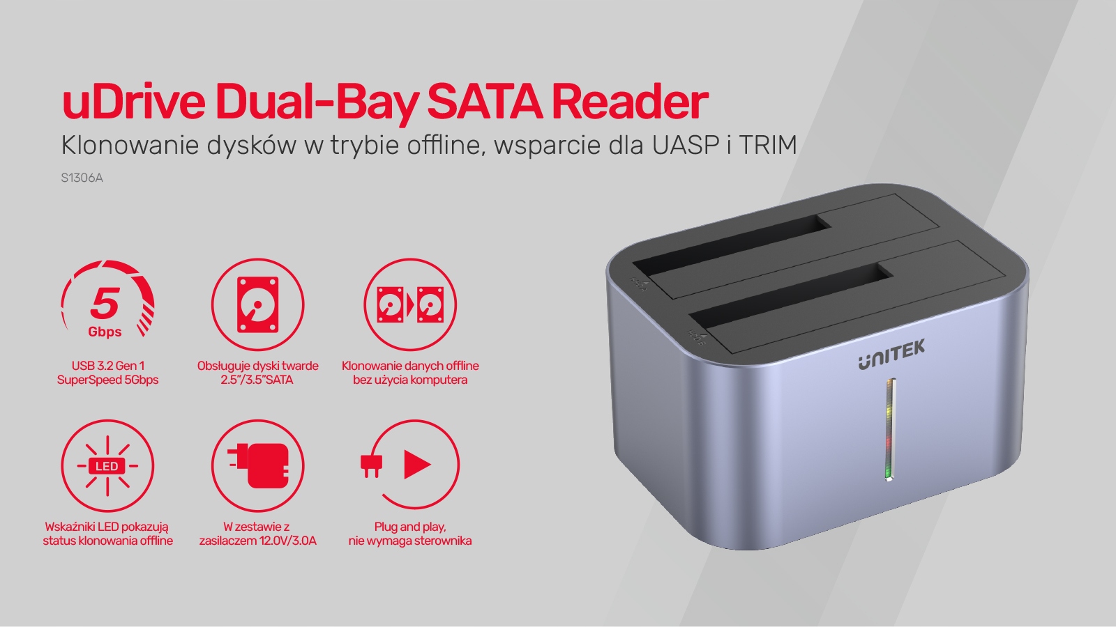 Unitek uDrive Dual-Bay SATA Reader — це станція для клонування накопичувачів SATA та SSD. Аксесуар дозволяє копіювати дані навіть без підключення до комп'ютера. Цей пристрій створений для вимогливих користувачів - він характеризується високими параметрами передачі даних, а алюмінієвий корпус Space Grey чудово виглядає на робочому столі.