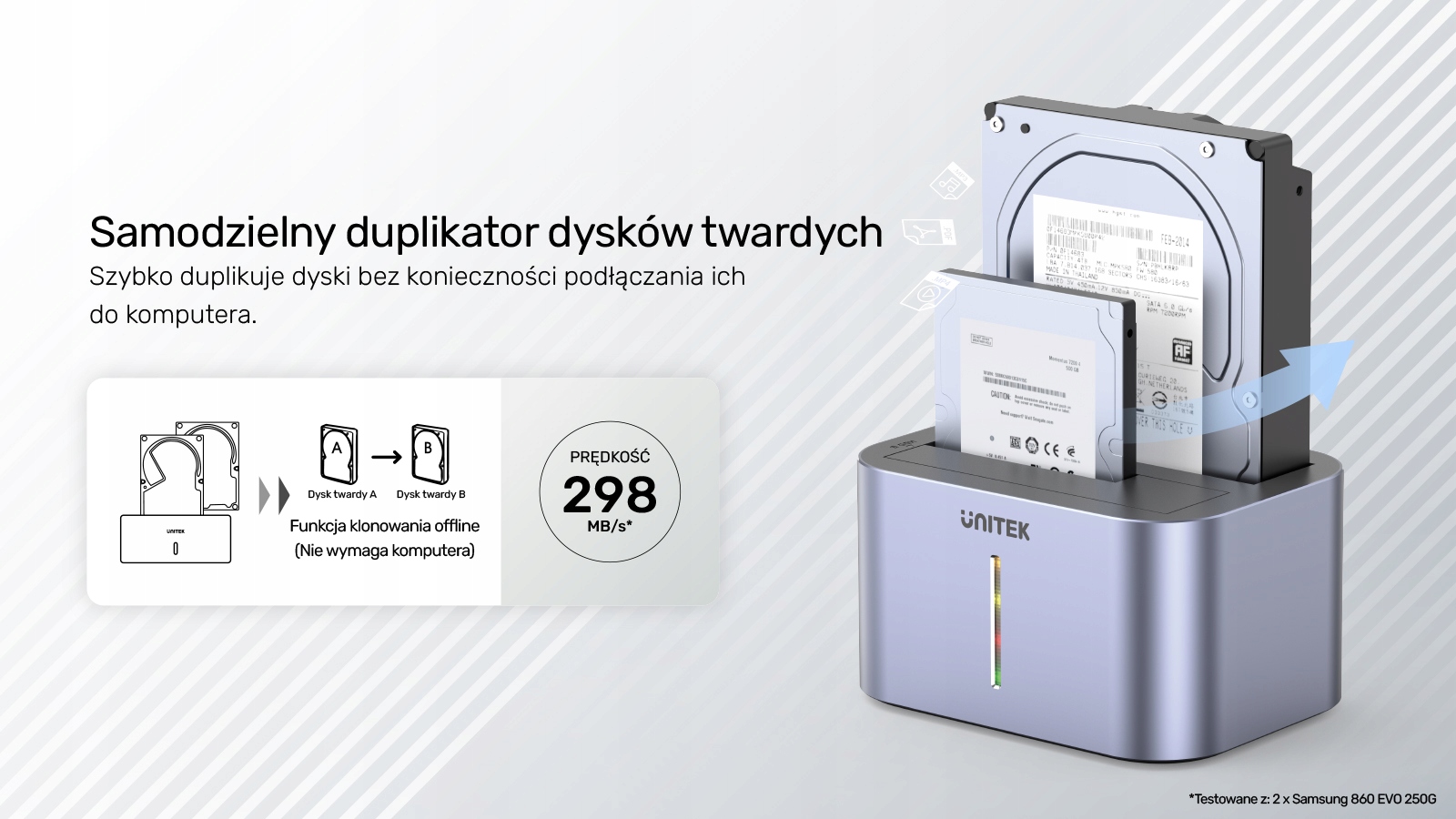 Автономний дублікатор даних Unitek uDrive Dual-Bay може працювати без підключення до комп’ютера. Все, що вам потрібно зробити, це помістити диски в слоти та натиснути кнопку клонування! Ємність цільового диска має бути більшою або дорівнювати ємності вихідного диска.