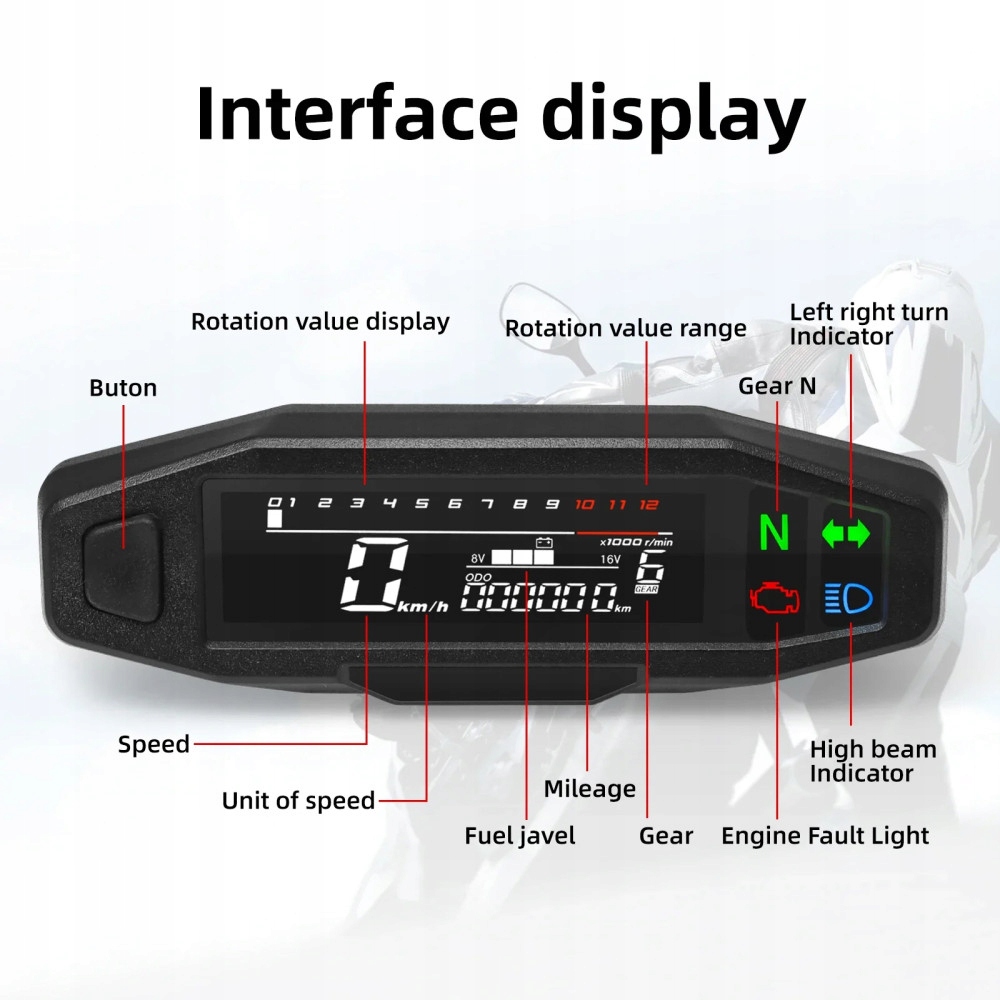 Функції включають: спідометр, одометр, тахометр, індикатор рівня палива, РК-дисплей дуже чіткий, кут огляду широкий і м’який, знімає втому очей.