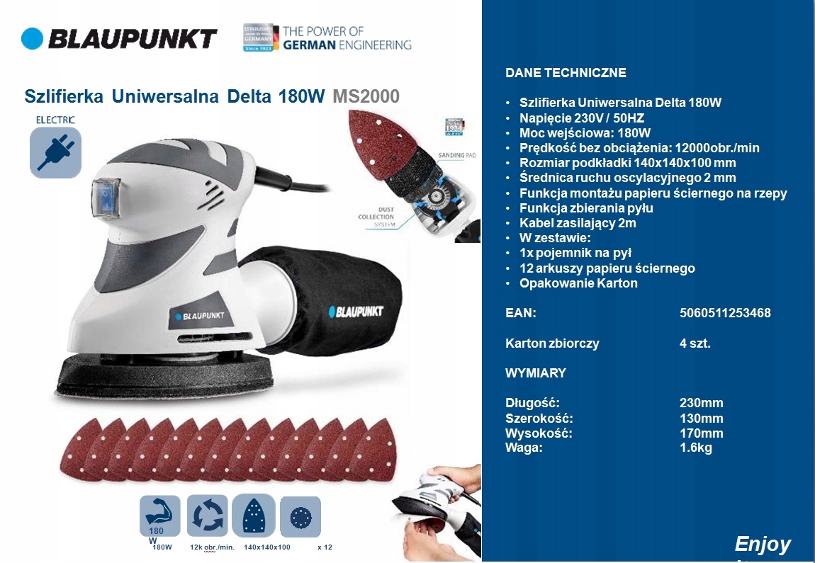 УНІВЕРСАЛЬНА Шліфувальна машинка 180 Вт Blaupunkt MS2000