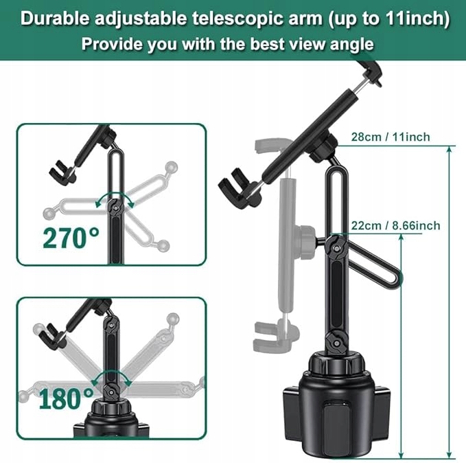 - 【Покращена регульована подовжена подовжена рука】: ця нова автомобільна підставка для мобільного телефону кріпиться до підстаканника в автомобілі, має розширення горловини для регулювання висоти. Цей тримач для планшета можна вільно розширювати та стискати, тому його довжина може становити від 22 до 28 см. Шарнірний важіль для легкого регулювання на 270 градусів і гнучкий кульовий шарнір для обертання на 360 градусів забезпечують найкращий кут огляду.