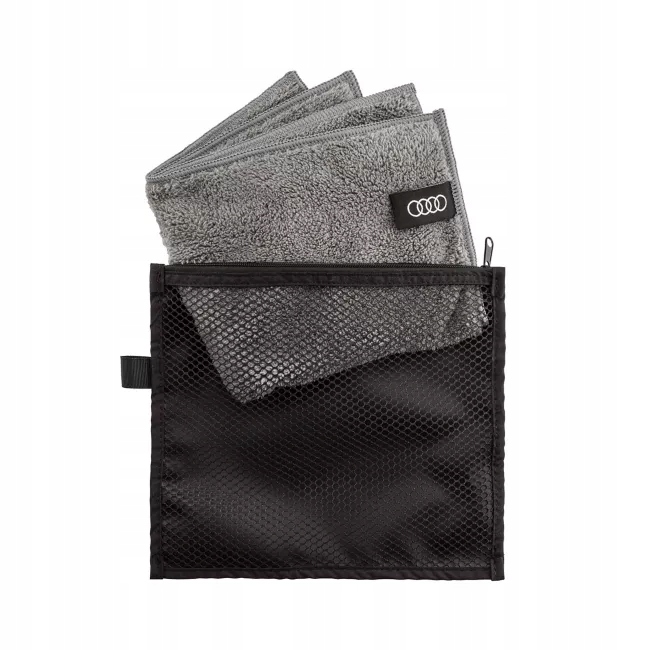 Високоякісна Очищена тканина Очищення внутрішніх та зовнішніх поверхонь транспортного засобу, а також заряджаючі кабелі від бруду, пилу та фінгерів. Тканина дуже поглинаюча. Довговічний і миючий. Він містить сумку для зберігання з кільцями Audi та сіткою для сушіння на відкритому повітрі. Універсальна тканина для чищення та мішок для зберігання виготовляються у 80% перероблених матеріалів.