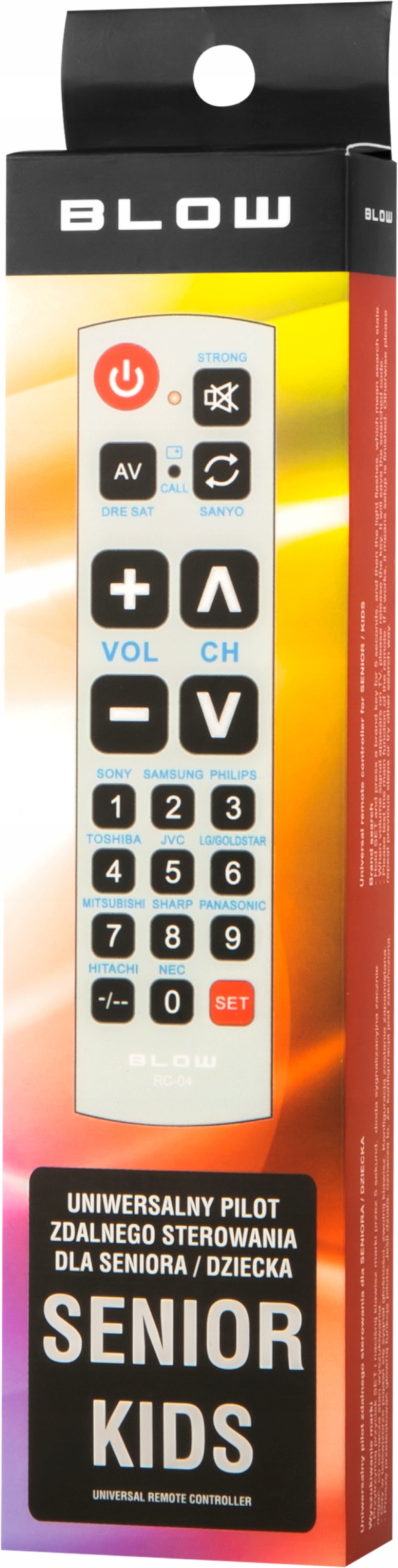 Унікальний пульт дистанційного керування BLOW, призначений переважно для людей похилого віку - він характеризується, перш за все, великими кнопками та простим управлінням, і в той же час повною функціональністю для основних завдань, пов'язаних з використанням телевізора. У набір входить детальна інструкція, яка показує аж 4 способи налаштування з пристроями.