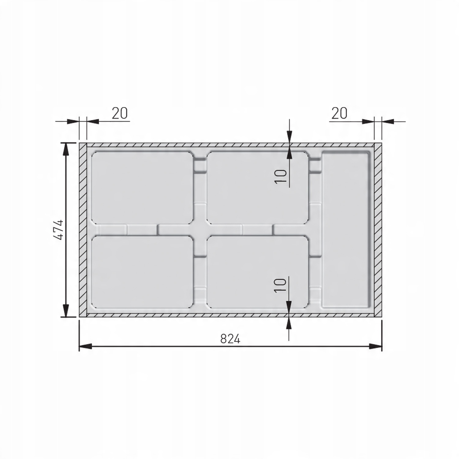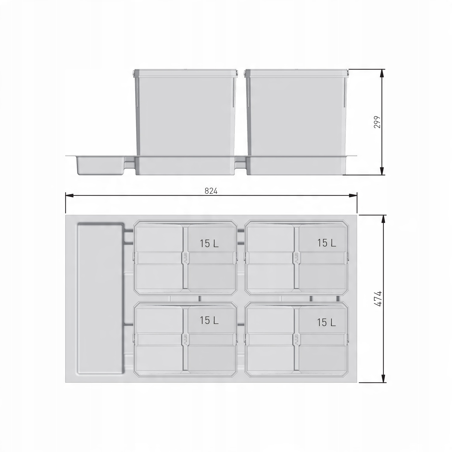 Сортувальник сміття призначений для ящиків із передньою стороною 90 см. До продукту входить вкладиш, який можна розрізати, і чотири контейнери об’ємом 15 л. На лотку є місце, куди можна легко зберігати, наприклад, пакети для сміття або побутову хімію.