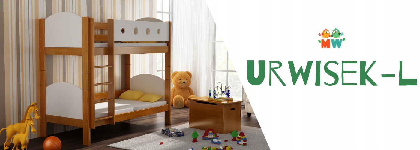 URWISEK L - двоярусне ліжко, яке можна розділити на два окремих ліжка. Виготовлена з високоякісної деревини сосни в поєднанні з міцною меблевою дошкою в підголівниках і верхніх рейлінгах. Драбина кріпиться праворуч або ліворуч від ліжка і має плоскі зручні сходинки, а краї дерев’яної конструкції мають округлі форми. Характерною рисою даної моделі є гладкі дугоподібні підголівники та бічна верхня планка, прикрашена вирізаними колами.