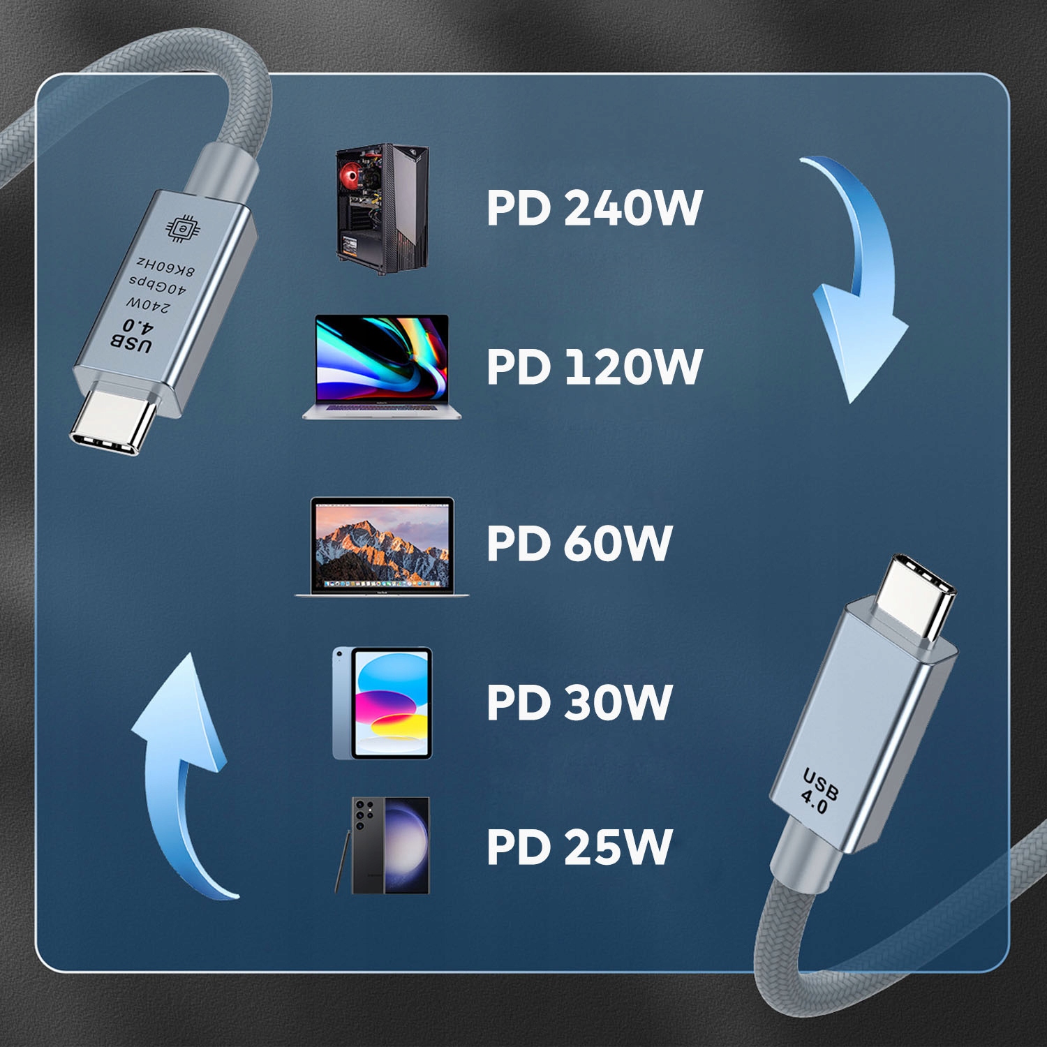 ⭐ Виготовлений з найвищої якості матеріалів USB-C USB4 забезпечує швидкість передачі даних до 40 Гбіт/с , супер швидка зарядка до 240 Вт та зображення Передача між пристроями до роздільної здатності 8 к/60 Гц . Це зручне рішення для людей, які цінують мінімалізм та продуктивність. алюмінієва конструкція плагіни та багатошарова, щільна коса збільшують пошкодження пошкодження. сумісний з пристроями, оснащеними з'єднувачем USB-C
