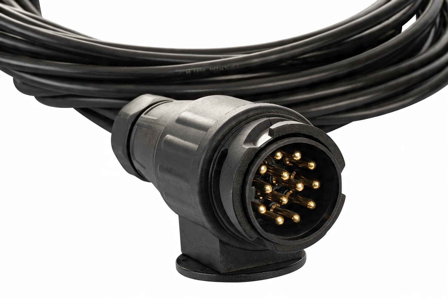 - 13-контактний електричний кабель причепа має довжину 7 метрів із поперечним перерізом жили 0,5 мм і підходить для електроустановки в причепах автомобільних, будівельних, човнових, міні-екскаваторів і евакуаторів.