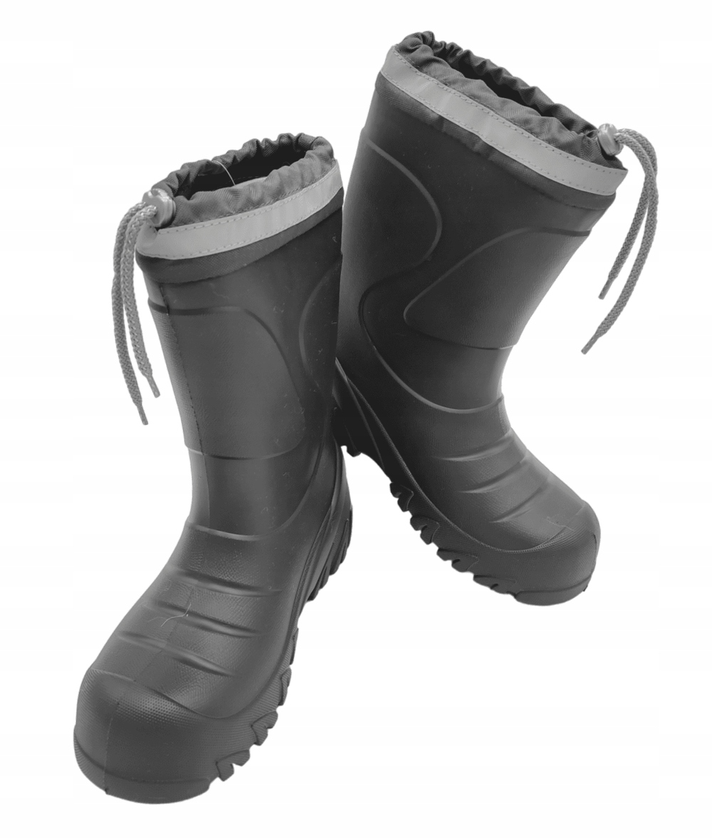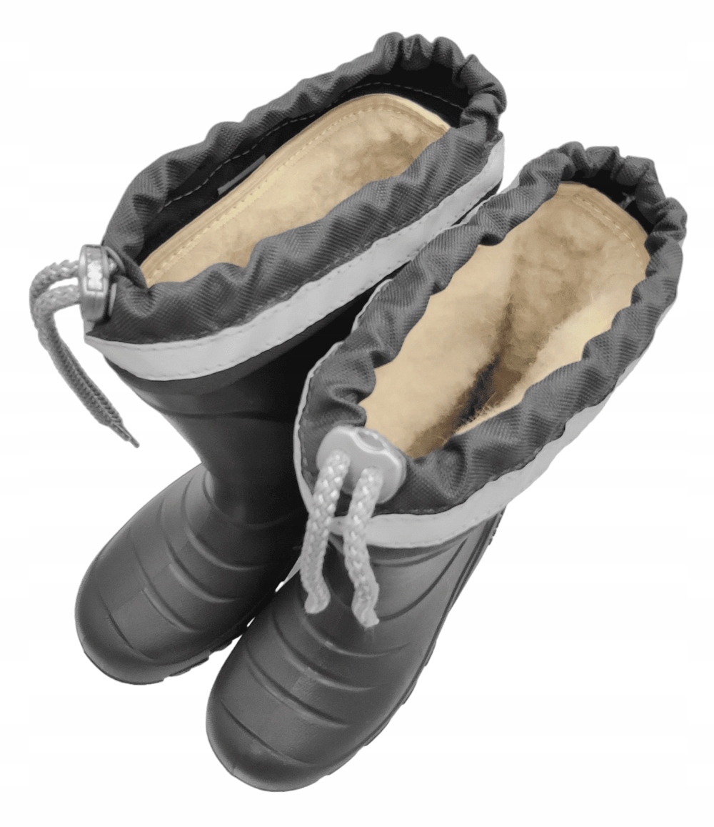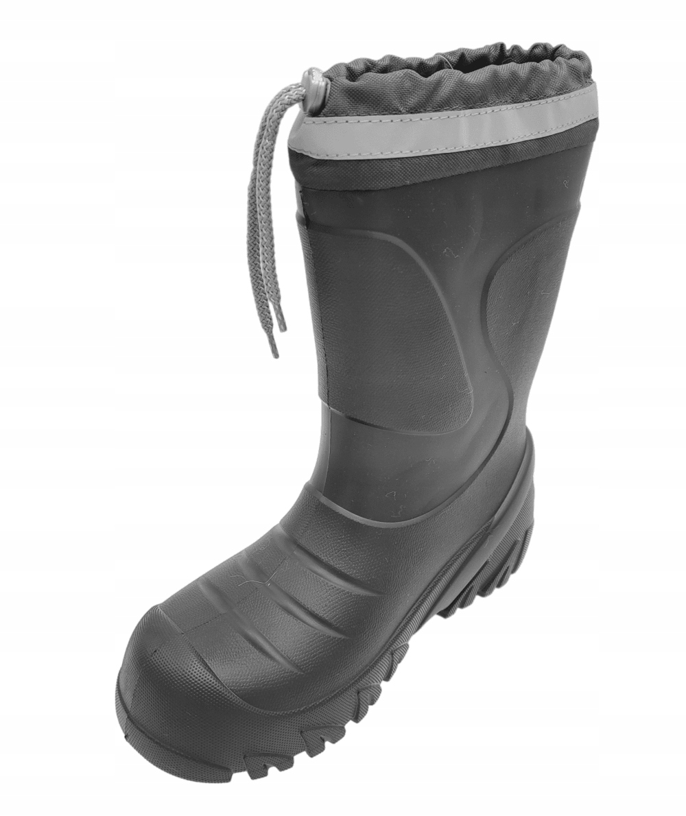 Дуже легкі утеплені дитячі черевики Wellington. Колір: сірий. Модель оснащена практичним регульованим коміром, який запобігає потраплянню снігу всередину взуття, знімною утеплюючою вставкою з натуральної вовни (можна прати до 40°C) і світловідбиваючими стрічками, що підвищують видимість при слабкому освітленні. Капони виготовлені з надзвичайно легкого матеріалу EVA, який є міцним, водонепроникним і залишається гнучким навіть за низьких температур. Піна EVA еластична завдяки бульбашкам повітря в матеріалі та дуже добре поглинає удари. Підошва забезпечує хороше зчеплення з мокрою поверхнею. Веллінгтони дуже зручні у використанні, верх дозволяє ефективно надягати і знімати, легко підтримувати в чистоті. Резинки ідеально підходять для активних дітей, які не бояться холоду та дощу, люблять прогулянки та ігри на свіжому повітрі. Вони стануть у пригоді як у вільний час, так і дорогою до школи.