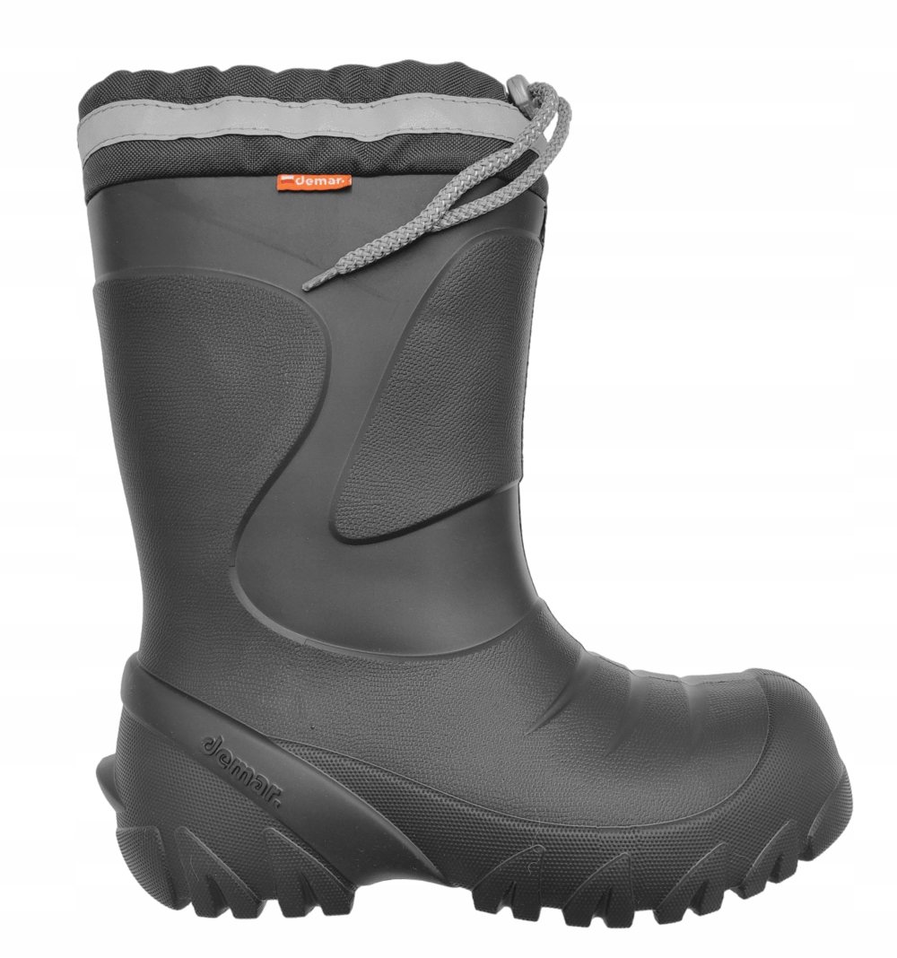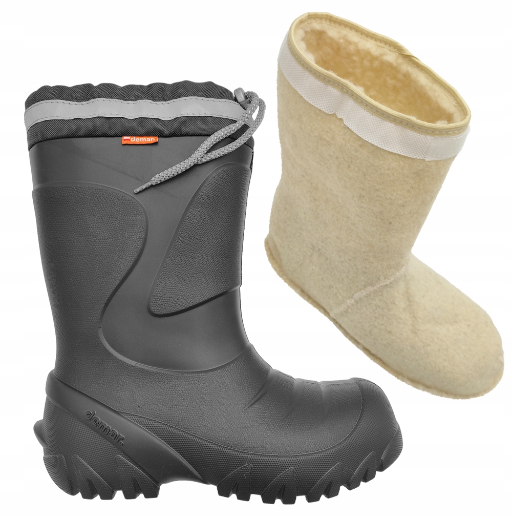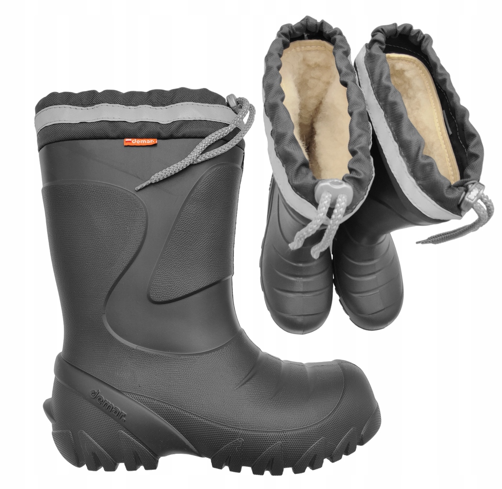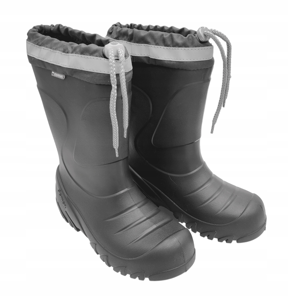 Дуже легкі утеплені дитячі черевики Wellington. Колір: сірий. Модель оснащена практичним регульованим коміром, який запобігає потраплянню снігу всередину взуття, знімною утеплюючою вставкою з натуральної вовни (можна прати до 40°C) і світловідбиваючими стрічками, що підвищують видимість при слабкому освітленні. Капони виготовлені з надзвичайно легкого матеріалу EVA, який є міцним, водонепроникним і залишається гнучким навіть за низьких температур. Піна EVA еластична завдяки бульбашкам повітря в матеріалі та дуже добре поглинає удари. Підошва забезпечує хороше зчеплення з мокрою поверхнею. Веллінгтони дуже зручні у використанні, верх дозволяє ефективно надягати і знімати, легко підтримувати в чистоті. Резинки ідеально підходять для активних дітей, які не бояться холоду та дощу, люблять прогулянки та ігри на свіжому повітрі. Вони стануть у пригоді як у вільний час, так і дорогою до школи.