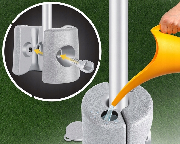 4 Вага однієї основи з начинкою становить від 9 до 16 кг, а стопи відповідають стандартним павільйонам діаметром полюса від 20 до 40 мм, забезпечуючи надзвичайно сильне і стабільне утримання.Ви також набираєте високу стабільність павільйонних ніг Кессера. Завдяки системі наповнення ви можете вибрати з різних матеріалів, таких як пісок, вода або каміння, що дозволяє оптимізувати стабільність залежно від погодних умов. Наповнюючи верхню частину основи, ви можете легко відрегулювати її вагу.