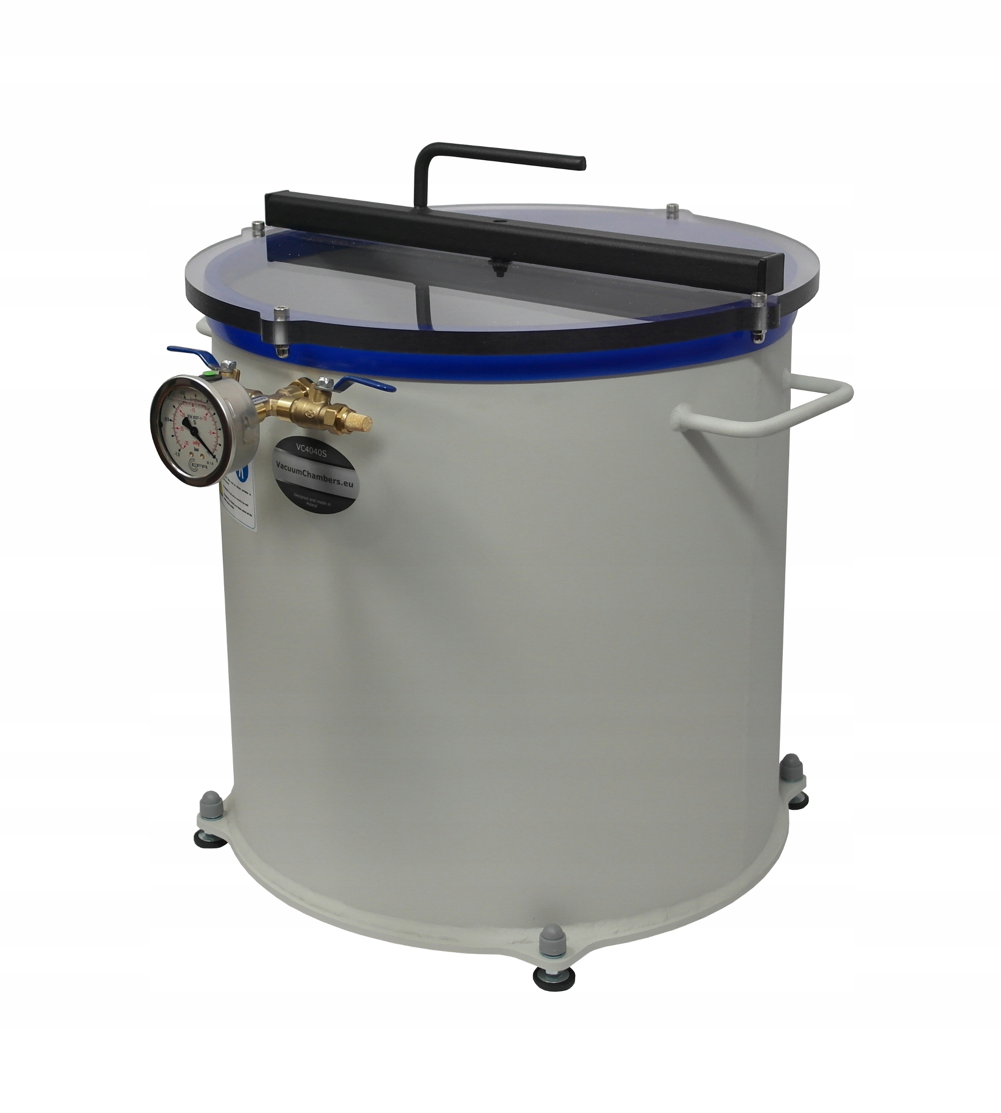 камерний резервуар виготовлений з порошкоподібної чорної сталі, його потужність -50,0 л, а внутрішні межі: діаметр 40cm на 40CM. Кришка камери виготовлена з товстого полікарбонату, додатково підсилений сталевим профілем. Бак оснащений вулканізованою силіконовою прокладкою. Використовувана ущільнювач міцна і демонструє низьку сприйнятливість до механічної деформації. Відмінна прозорість віку дозволяє спостерігати процес дегазації. Два кульові клапани дозволяють вільно контролювати процес депутації, а встановлений гліцериновий Zicometer вказує на поточне значення вакууму в камері. Камера оснащена фільтром для впускного повітря, який фактично запобігає потраплянню домішок у дегазований матеріал. Камера підключена до насоса за допомогою, на якій посилений шланг із внутрішнім діаметром 8 мм і встановлено довжину 1,5 м. Весь виготовлений з найвищої якості матеріалів та фірмової нитки, що працює з кліщами. Усі наші вакуумні системи, перед доставкою замовнику, на 100% перевіряються та перевіряються.
