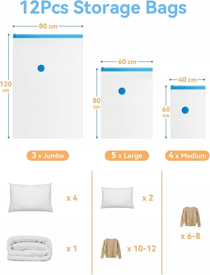 - Великий вибір розмірів: наш набір включає три різні розміри (120 x 80 см, 80 x 60 см і 60 x 40 см), які ідеально підходять для різного одягу та ковдр. У набір входить загалом 12 багаторазових пакетів.