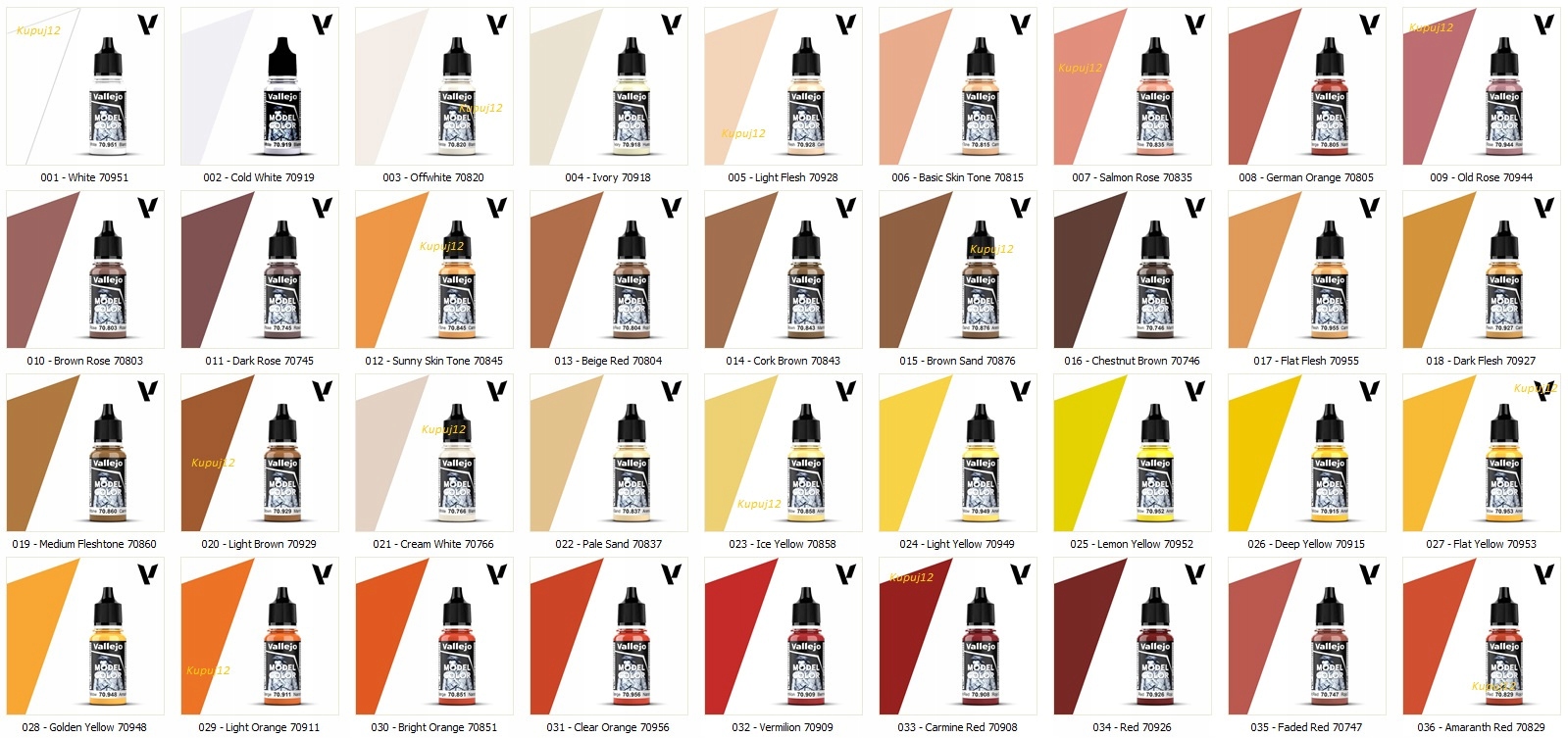 Акрилові фарби Vallejo МОДЕЛЬ Серія COLORвиключно добре покриває всі поверхні, маючи надзвичайну адгезію до смоли, пластику, сталі та білого металу. Вони негорючі та не містять розчинників.