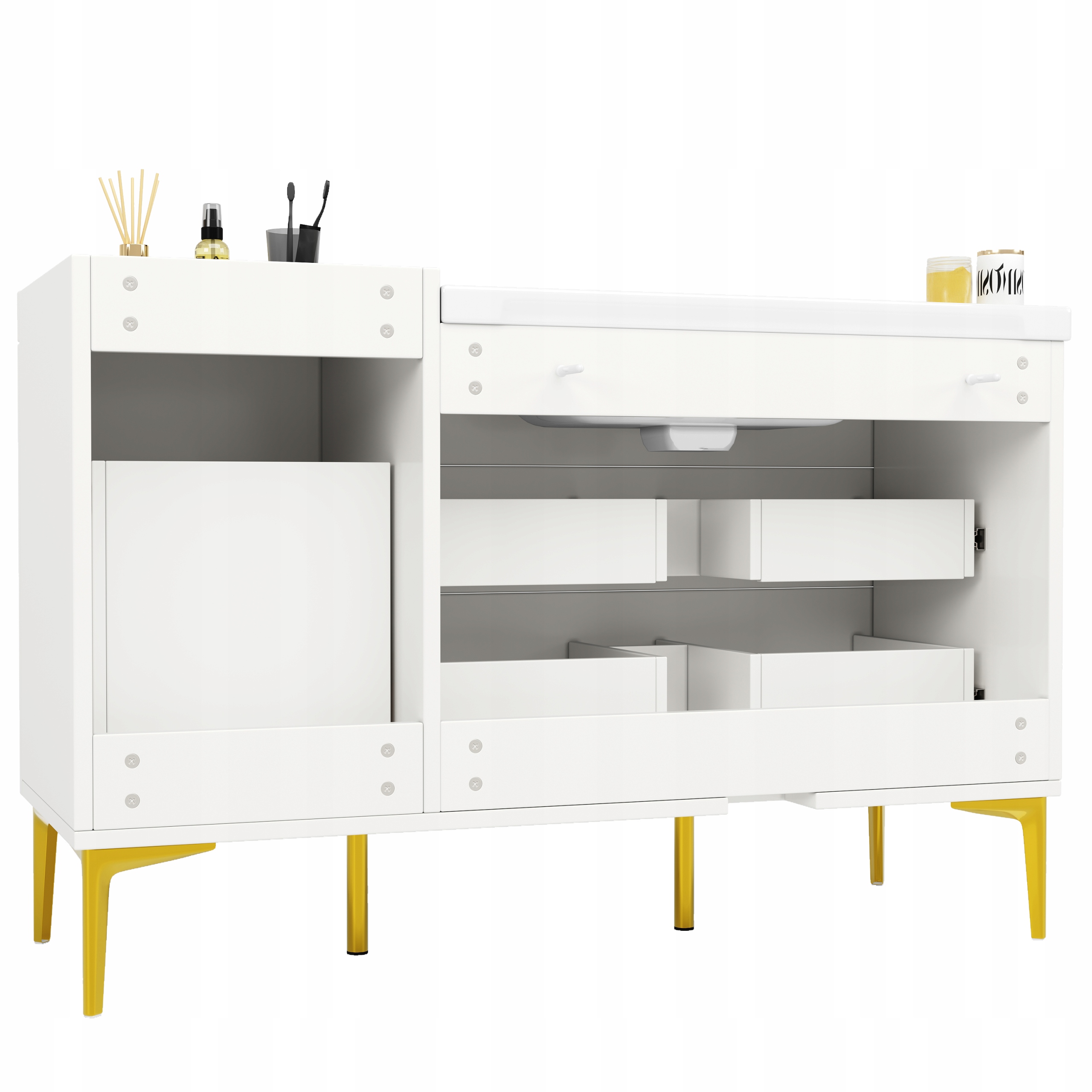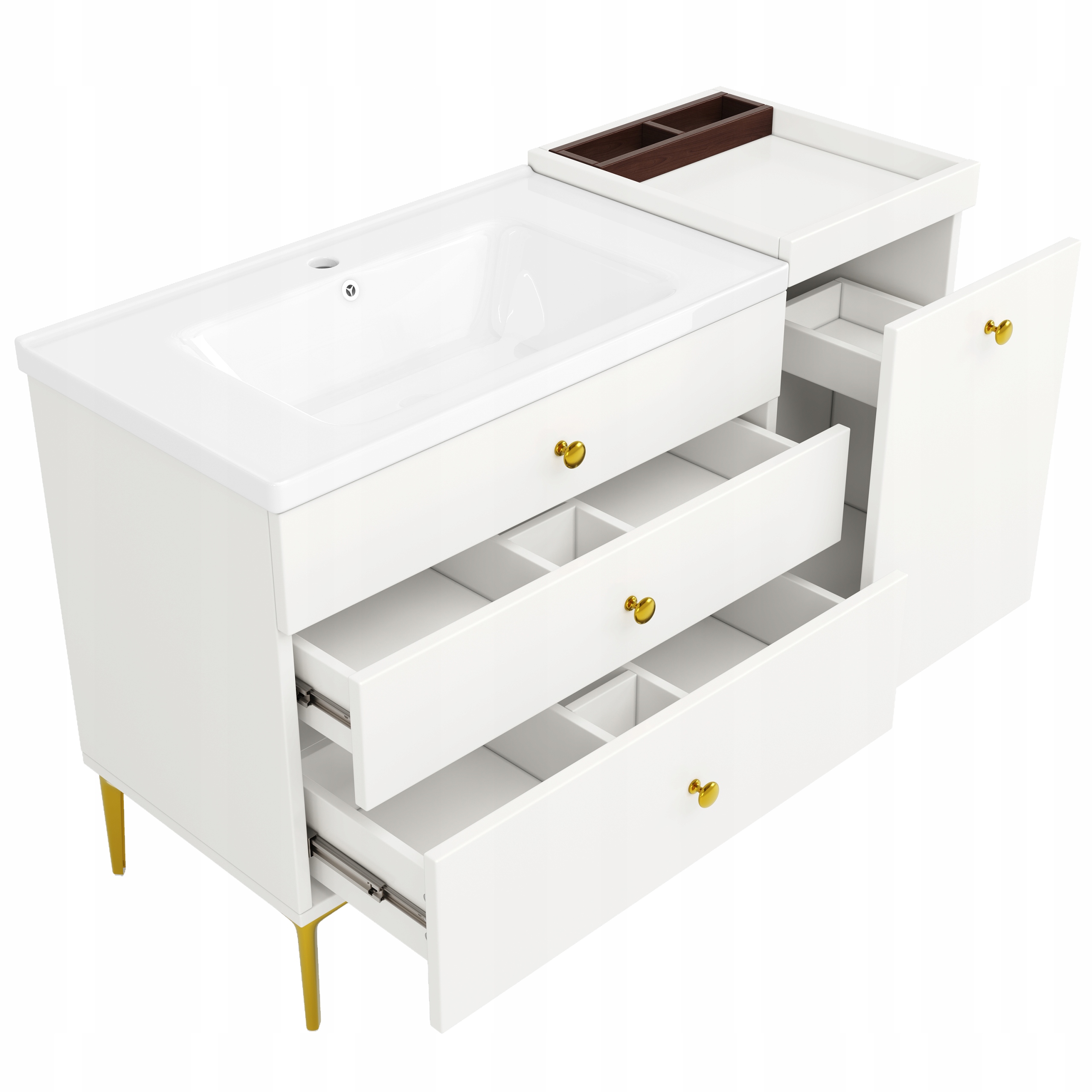 - Край робочої стільниці захищена від бризки та окремого місця, що дозволяє отримати доступ до води та встановлення стічних вод на дні шафи. Ящик оснащений посібником з низьким рівнем шуму, що забезпечує більш зручне використання. 4 Колір шафи буде домінуючим, але рекомендується вибрати його для однієї серії аксесуарів для ванної кімнати для підтримки цілісного стилю.