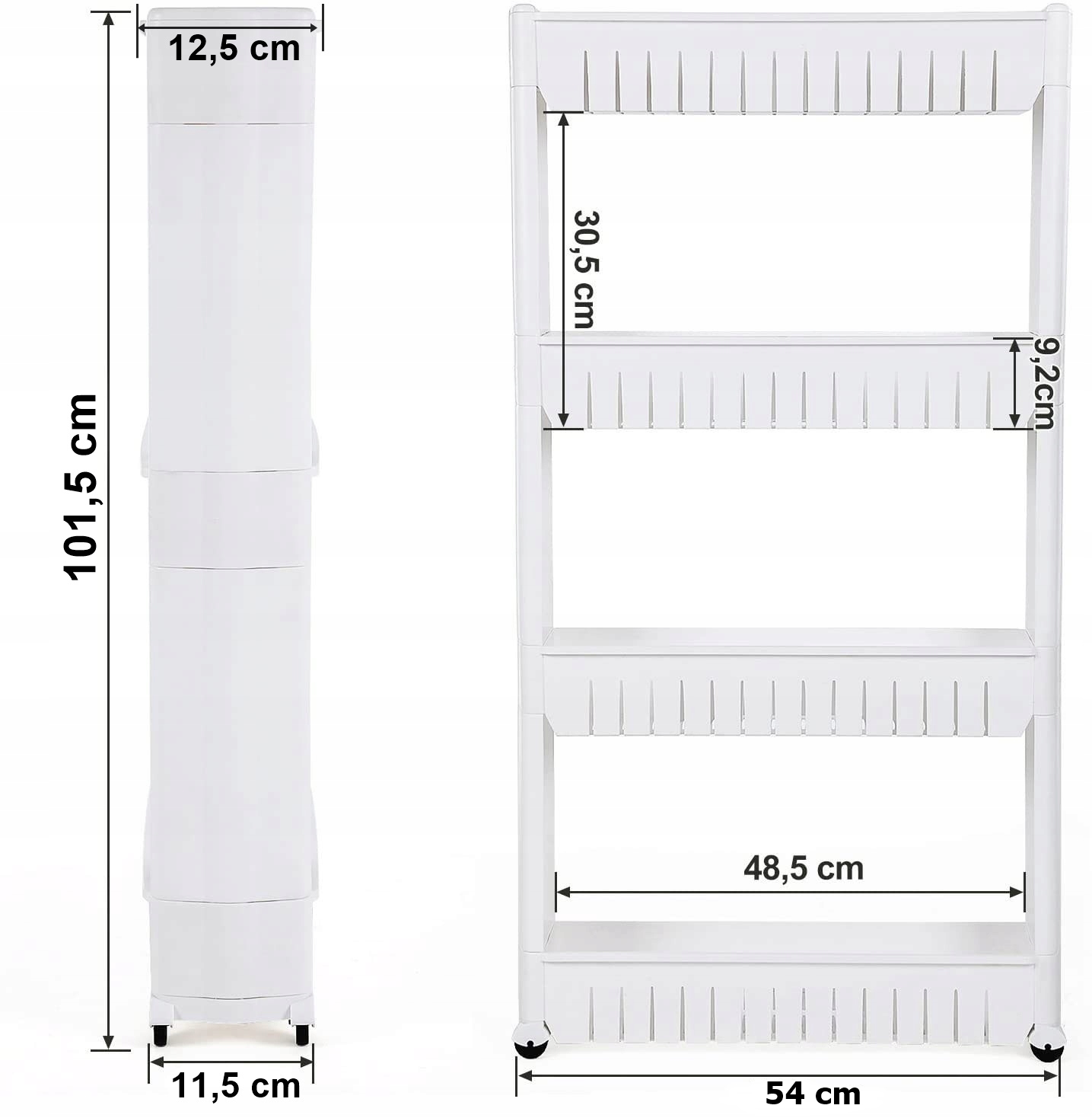 Полиця була розроблена для використання вузьких просторів, напр. між холодильником і шафою або між пральною машиною і шафою. Полиця має 4 глибокі полиці, які дозволять розмістити багато речей, наприклад, кухонне приладдя, пляшки, спеції. Він також чудово підійде як полиця для ванної кімнати для косметики, паперу, рідин або порошків. Використання 4 коліщаток дозволить легко і швидко переміщати полицю.