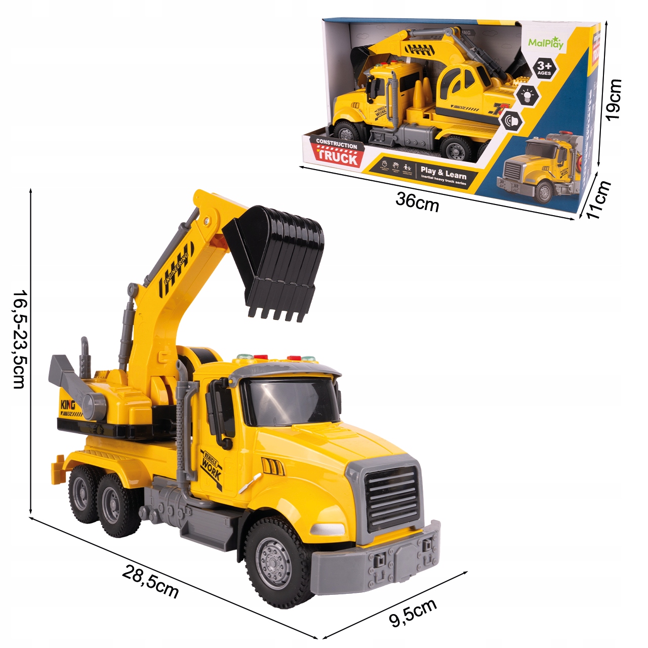 Вантажівка-екскаватор упакована в барвисту, естетичну подарункову коробку з віконцем. Завдяки своїм великим розмірам і світловим ефектам він справляє велике враження на дітей - ідеально підходить для днів народжень, свят або Дня захисту дітей. Ми гарантуємо: ваш малюк не захоче з ним розлучатися!