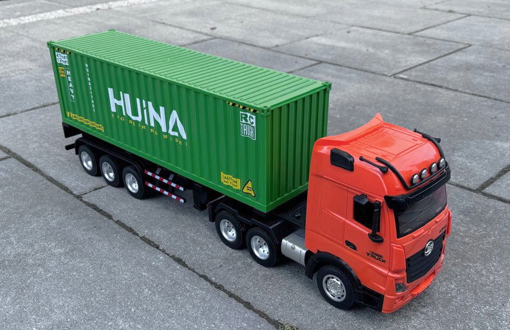 Вантажівка на дистанційному керуванні з контейнером, що відкривається. Достовірно відтворена модель із дистанційним керуванням у масштабі 1:18.
