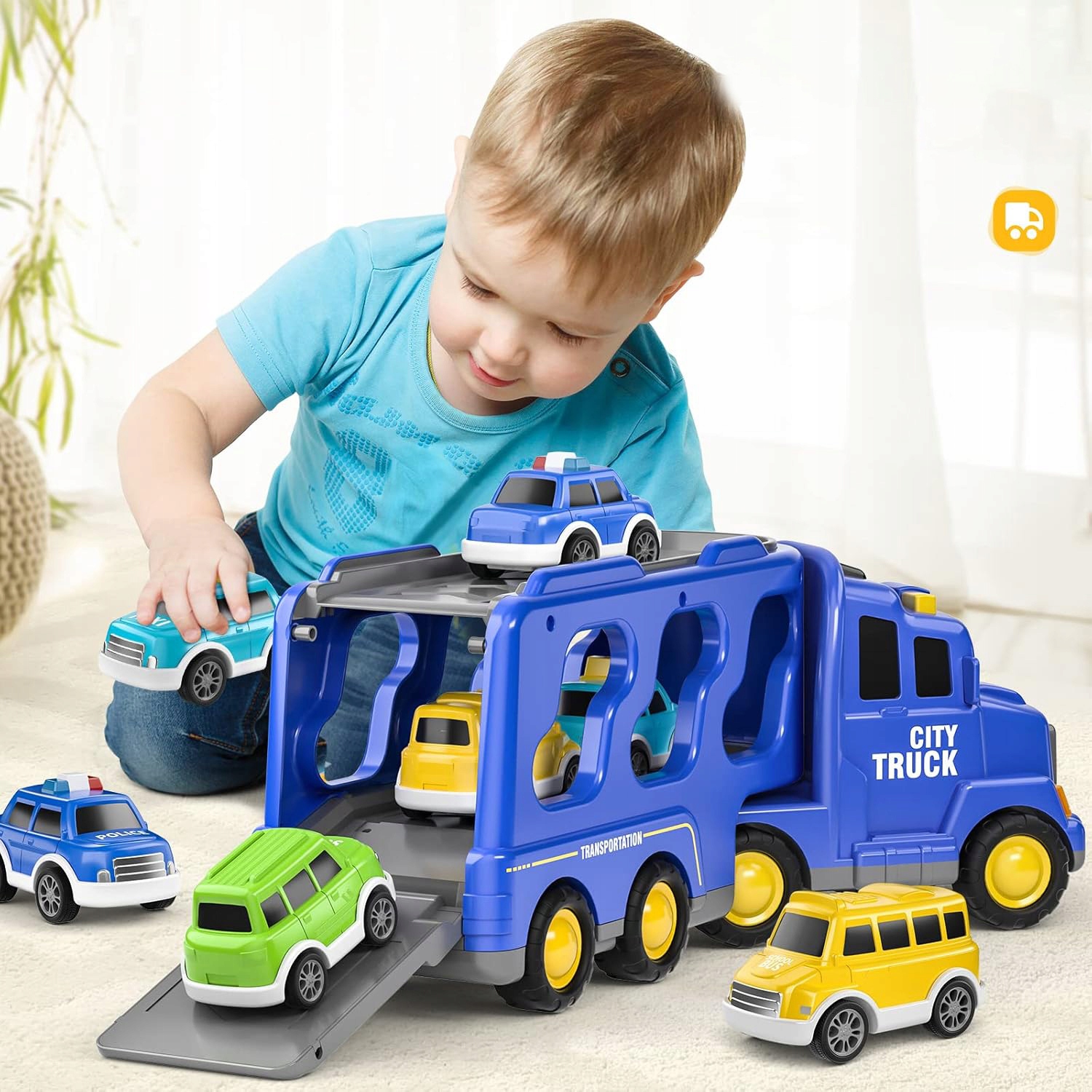 - 🛻 Просто штовхніть вантажівку впереді вона готова до їзди з чотирма автомобілями! Голова вантажівки обертається. Відокремте кабіну від буксирувальної зони, потім відкрийте двері багажника, щоб опустити автомобілі. Штовхайте машини назад, і вони поїдуть вперед. Ідеальна іграшка для хлопчиків від 3 років.