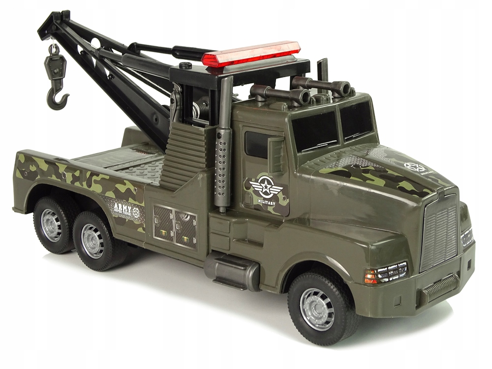 - Весь автомобіль має камуфляж із військовими наклейками, що ідеально підходить для любителів армії. Кожна деталь ідеально відтворена. Ззаду автомобіля розташований кран з буксирним тросом, який висувається за допомогою кривошипа, розташованого збоку автомобіля. На самому кінці є гак, просто прикріпіть іншу іграшку та транспортуйте її в потрібне місце на полі бою або на місце аварії. Коли ви тягнете назад і штовхаєте вперед, він досягає надшвидкості, оскільки він має фрикційний привід. Автомобіль, який поповнить колекцію вашого малюка.