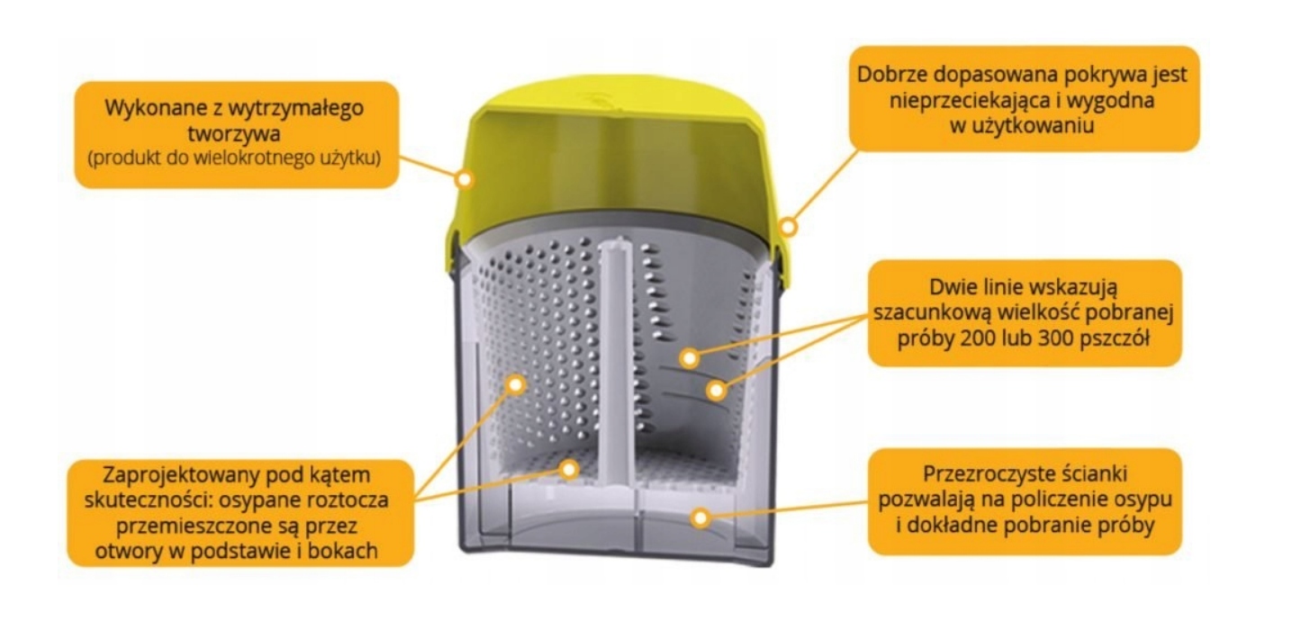 🔹 Характеристики продукту:✅ Простий і швидкий моніторинг варроа - результат за кілька хвилин✅ Точне виявлення кліщів - більш ефективний захист пасіки✅ Безпечно для бджіл - можливість тестування методом цукрової пудри✅ Ергономічний дизайн - простий у використанні та clean✅ Твердий матеріал – міцний, стійкий до пошкоджень матеріал