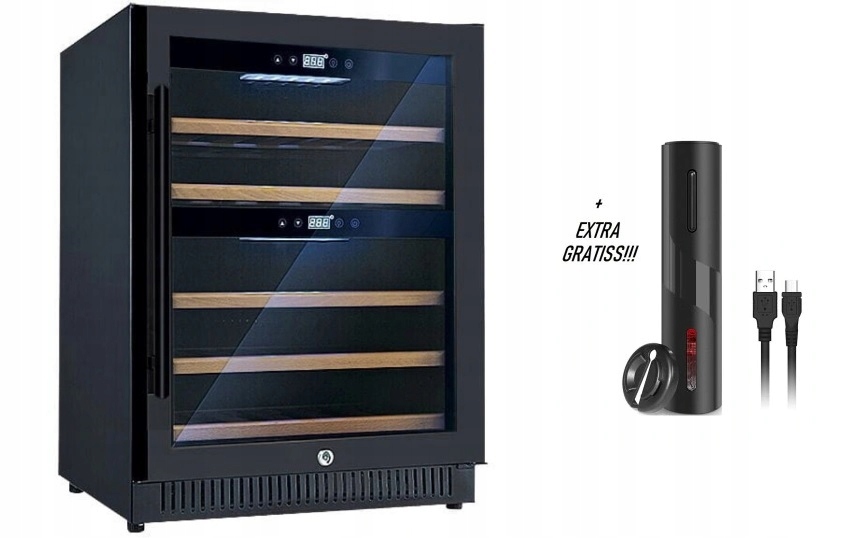 - Елегантний зовнішній вигляд, сталевий корпус у поєднанні зі склом і сучасна ручка з чорної нержавіючої сталі чудово виглядають на сучасних кухнях. Пляшки з вином розміщують на дерев'яних полицях.